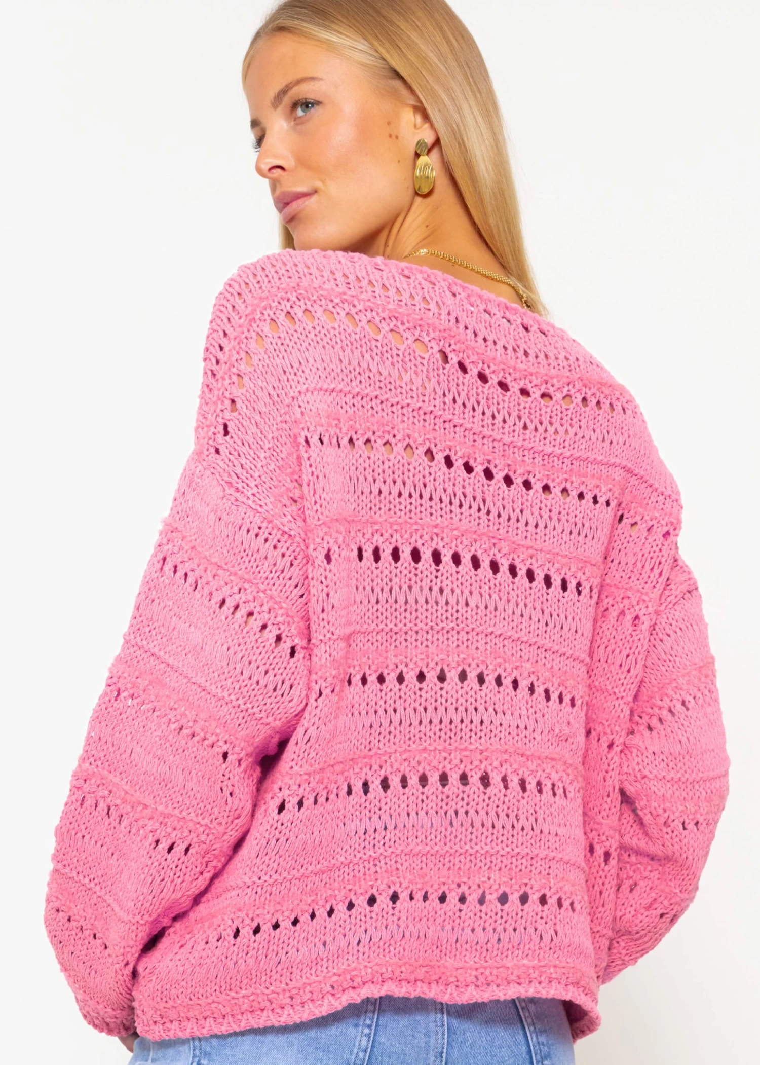 Verleihe deinem Outfit eine zarte und luftige Note mit diesem Ajour-Strickpullover. Das durchbrochene Strickmuster fügt dem Design eine subtile Transparenz hinzu, die stilvoll als auch elegant ist. Das Modell besitzt eine entspannte Silhouette, überschnittene Schultern und einen weiten Rundhalsausschnitt. Der Pullover ist nicht nur ein Blickfang, sondern auch ein Ausdruck von Raffinesse und modischem Bewusstsein.