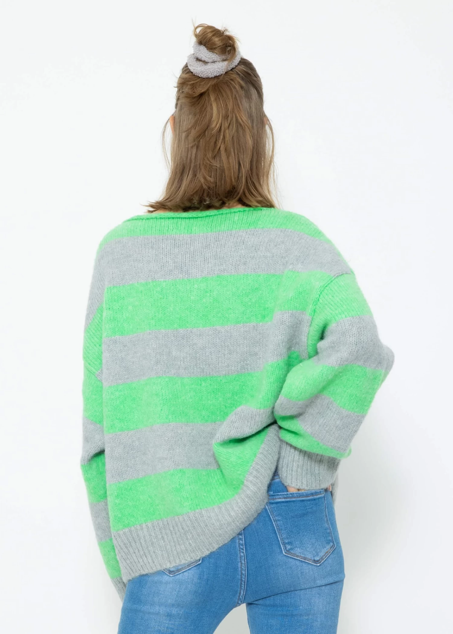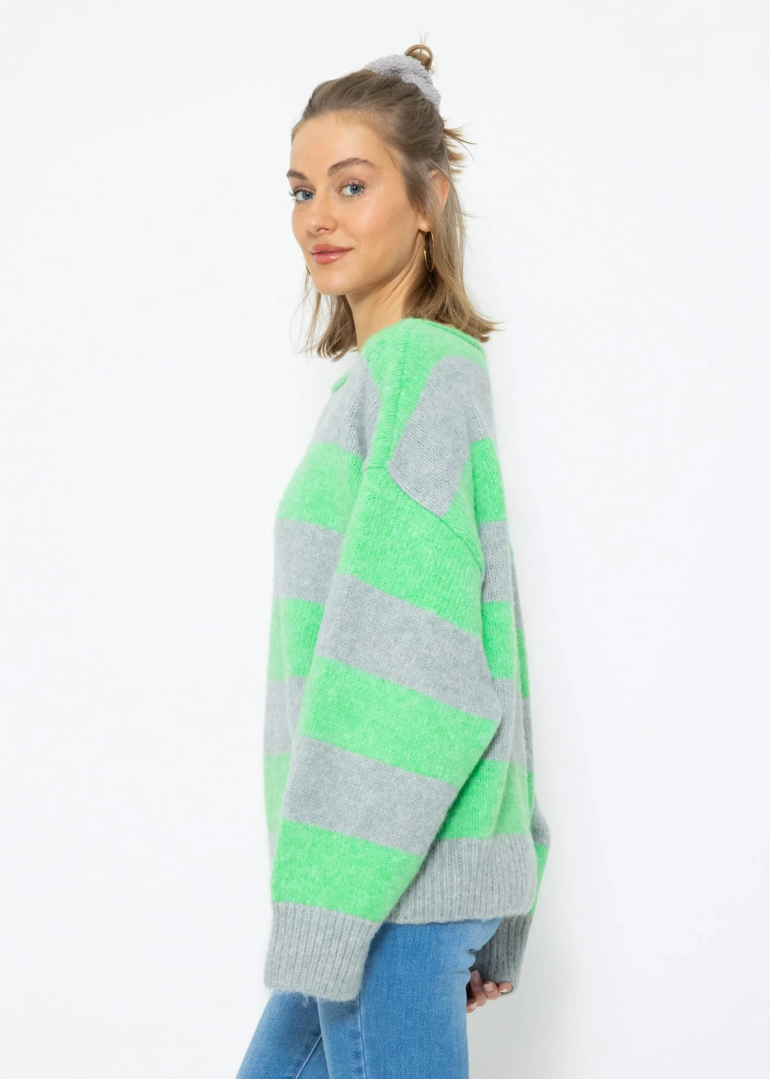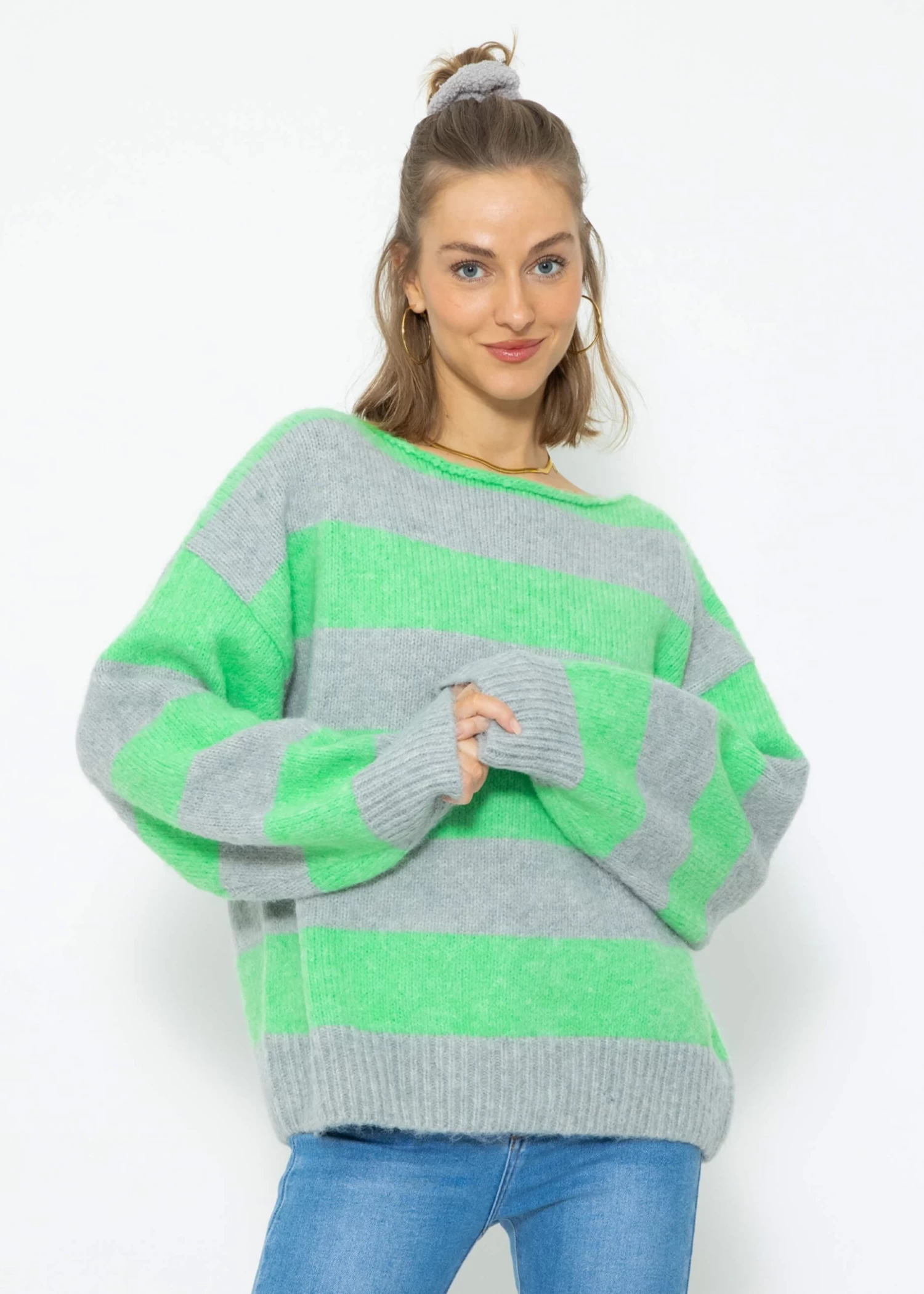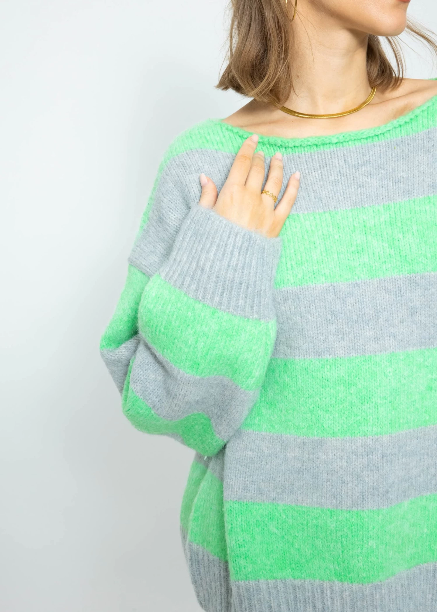 Dieser Pullover kombiniert Komfort und trendiges Design auf einzigartige Weise. Das Modell besitzt einen Oversize-Schnitt, der dem Pullover ein lässiges sowie trendiges Aussehen verleiht und Bewegungsfreiheit für den ganzen Tag bietet. Der U-Boot Ausschnitt sorgt für eine sportliche Note und betont sanft deine Schlüsselbeine. Weite Ärmel und überschnittene Schultern geben dem Design seine entspannte Silhouette, während der Streifen-Look eine zeitlose Eleganz und eine gewisse Raffinesse hinzufügt. Rippbündchen sowie ein gerippter Saum runden das Design gekonnt ab.