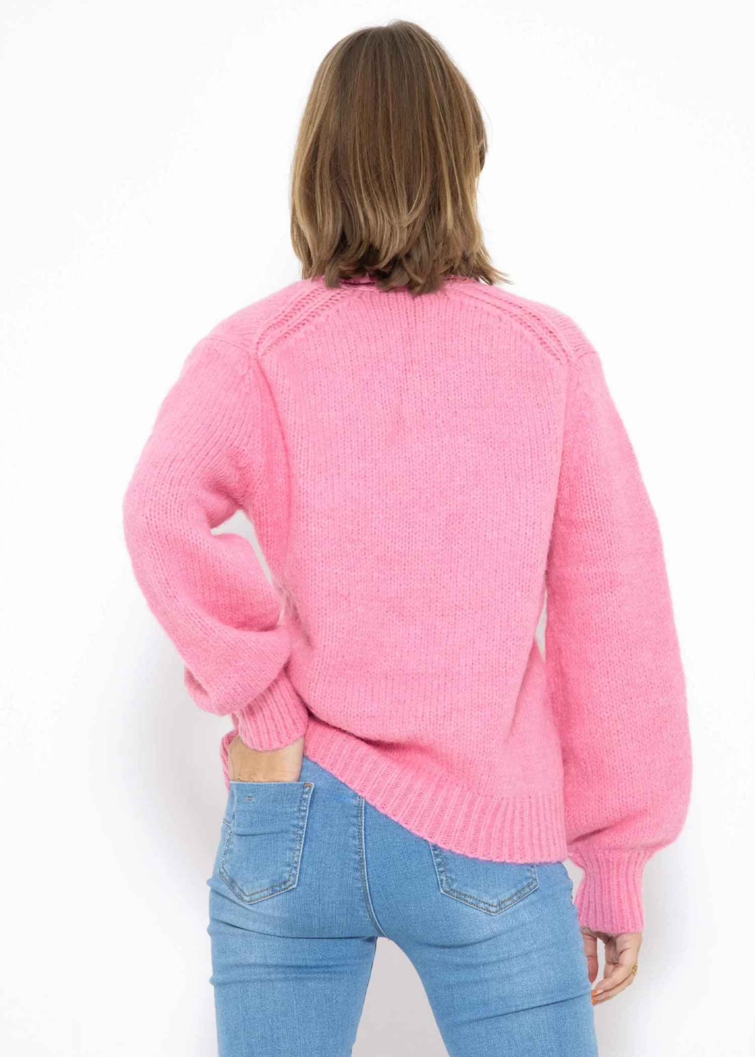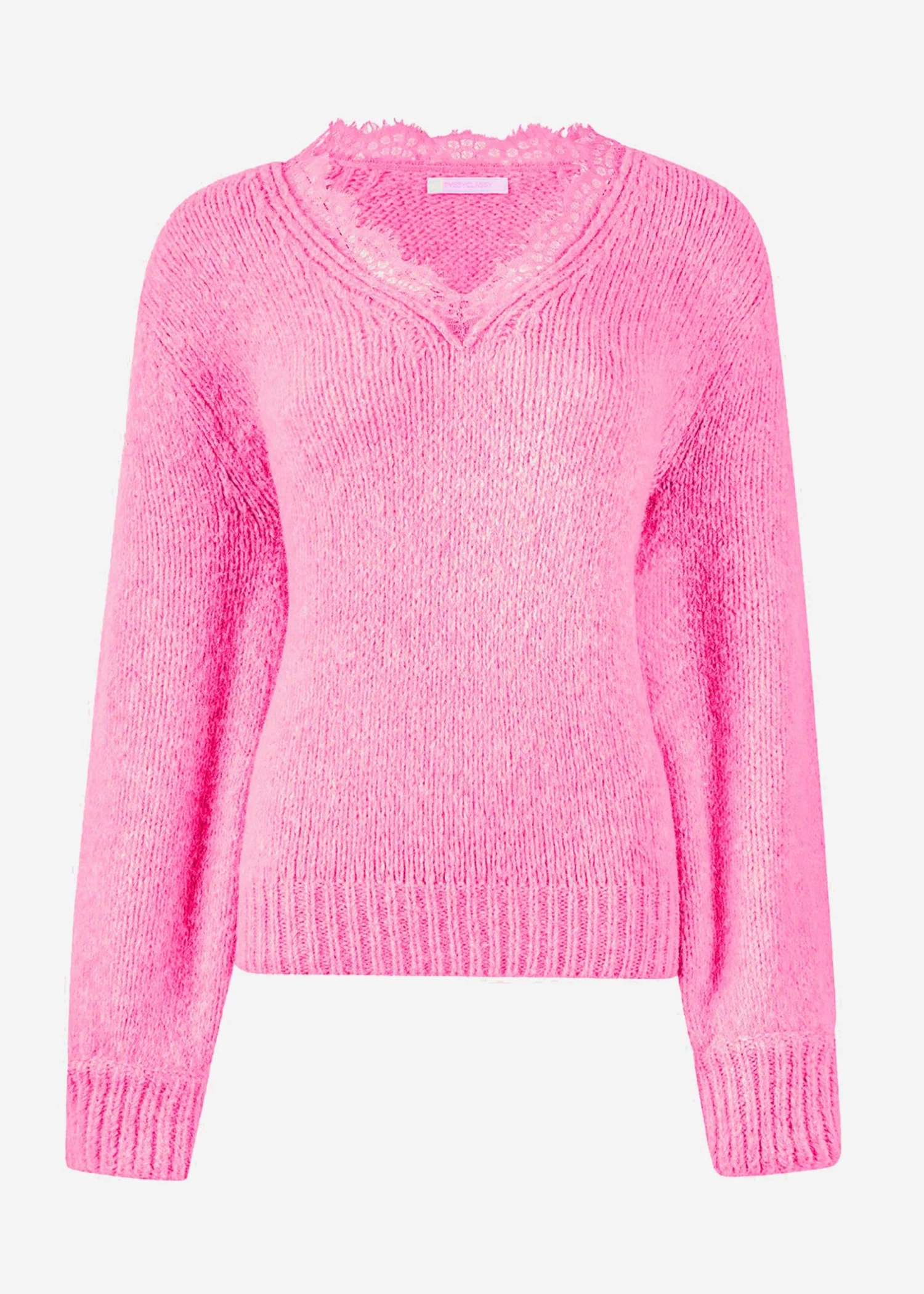 Wenn du nach einem Pullover von zeitloser Schönheit suchst, ist dieses Kleidungsstück die perfekte Wahl. Dieses Modell besitzt lange Ärmel mit Rippbündchen sowie einen gerippten Saum. Mit seiner Oversized-Passform und überschnittenen Schultern definiert der Pullover eine moderne Silhouette, die gleichzeitig lässig und dennoch stilvoll ist. Der klassische V-Ausschnitt ist mit Spitze verziert, wodurch der Pullover eine feminine, romantische Note bekommt und eine harmonische Verbindung zwischen dem Strick und der zarten Eleganz der Spitze geschaffen wird. Trage ihn mit deiner Lieblingsjeans und Sneakers für einen gemütlichen Alltagslook.