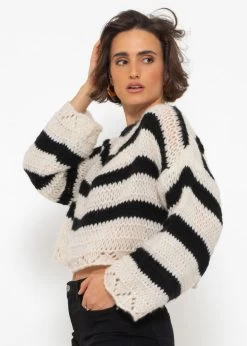 Dieser weiche, grobgestrickte Strickpullover präsentiert sich in einem zeitlosen, breiten Streifendesign und lässt sich leicht mit verschiedenen Outfits kombinieren. Die lockere Passform und die weiten Ärmel bieten einen modischen Look sowie maximale Bewegungsfreiheit. Das Modell besitzt charakteristische Ajour-Abschlüsse an Saum und Ärmeln, die eine feminine Raffinesse und ein luftiges Gefühl vermitteln. Das verkürzte Design lässt sich ideal mit hochgeschnittenen Hosen und Röcken stylen.