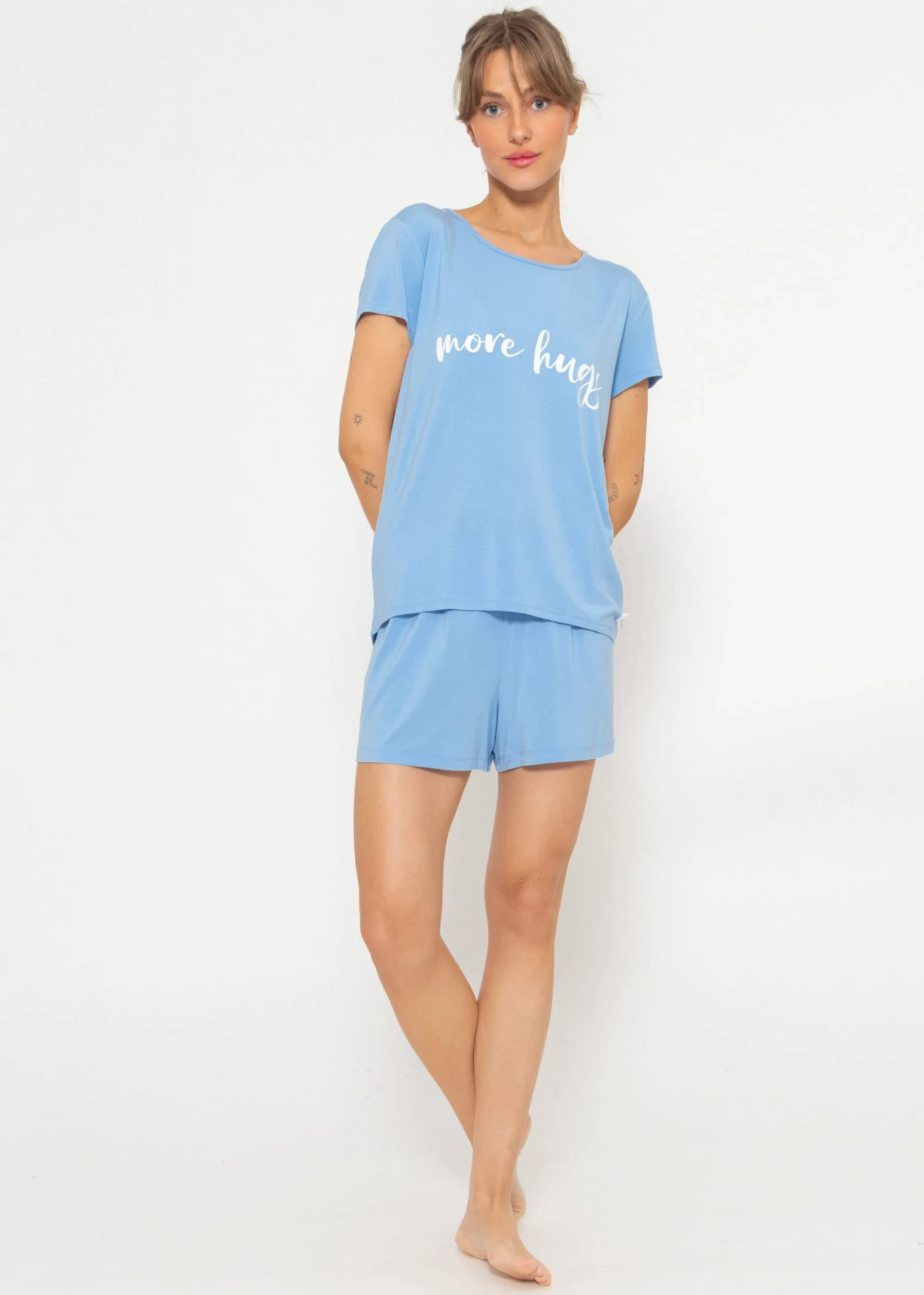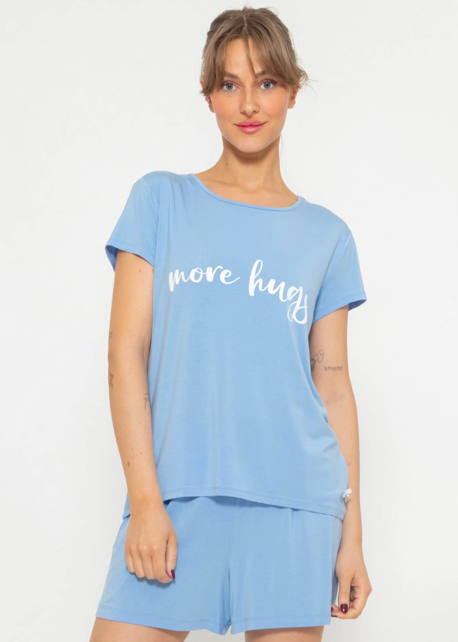Entdecke das ultimative Wohlfühlerlebnis mit unserem Kurzarm Schlafshirt – ein unwiderstehlich bequemer Begleiter für entspannte Nächte. Highlight bildet der süße Schriftzug „more hugs“, der dem Modell einen verspielten Touch verleiht. Am Saum befindet sich die einzigartige SASSYCLASSY Schleife, die das Design veredelt. Die lockere Passform und die kurzen Ärmel gewährleisten höchsten Komfort und maximale Bewegungsfreiheit.