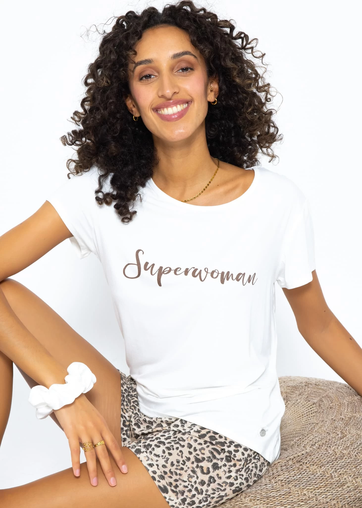 Entdecke das ultimative Wohlfühlerlebnis mit unserem Kurzarm Schlafshirt – ein unwiderstehlich bequemer Begleiter für entspannte Nächte. Highlight bildet der süße Schriftzug „superwoman“, der dem Modell einen verspielten Touch verleiht. Am Saum befindet sich die einzigartige SASSYCLASSY Schleife, die das Design veredelt. Die lockere Passform und die kurzen Ärmel gewährleisten höchsten Komfort und maximale Bewegungsfreiheit.