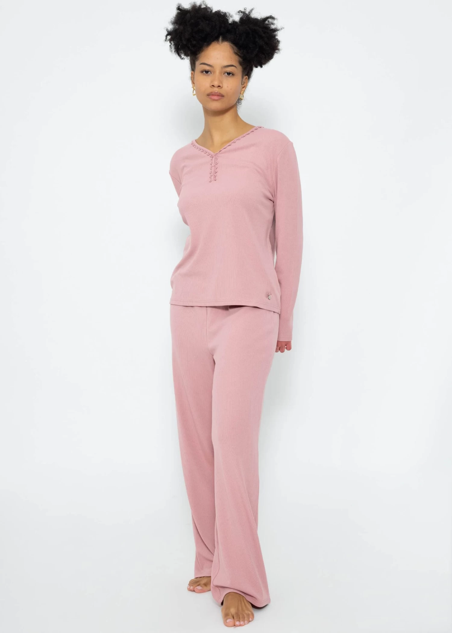 Erlebe ultimativen Komfort und stilvolle Entspannung mit dieser Pyjamahose. Das gerippte Material verleiht nicht nur eine ansprechende Textur, sondern sorgt auch für ein weiches und angenehmes Tragegefühl. Der elastische Gummibund gewährleistet eine bequeme Passform und ermöglicht einfaches An- und Ausziehen, während der locker geschnittene Stil der Hose maximale Bewegungsfreiheit bietet und zu einem Gefühl von Leichtigkeit beiträgt. Der Innenstoff ist besonders weich, um ein behagliches Gefühl auf der Haut zu bieten. Ideal für gemütliche Abende zu Hause oder für friedliche Nächte.