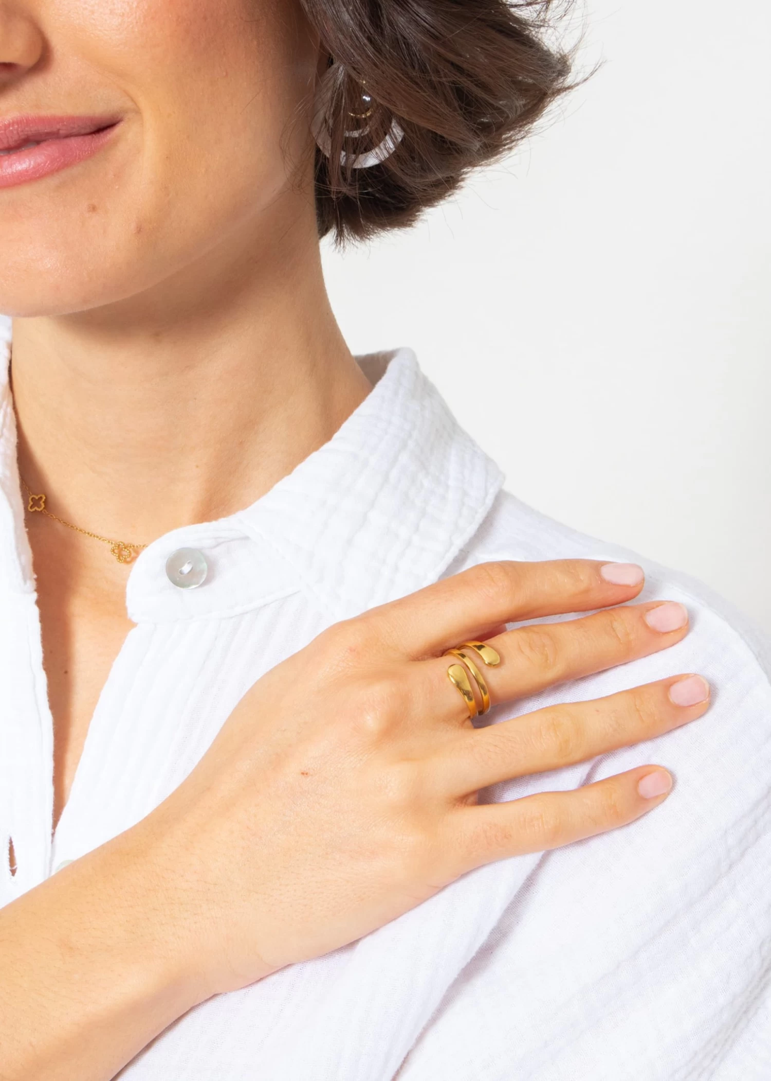 Entdecke pure Eleganz mit diesem zweisträngigen Ring. Das Modell charakterisiert sich durch zwei parallel laufende Bänder, die sich in einer sanften Spirale um den Finger wickeln. Das offene Design des Rings ist nicht nur ein stilistisches Highlight, sondern bietet auch eine flexible Passform, die sich an verschiedene Fingergrößen anpasst. Der schimmernde Goldton verleiht diesem Schmuckstück einen Hauch von Luxus, der zu jedem Anlass getragen werden kann.