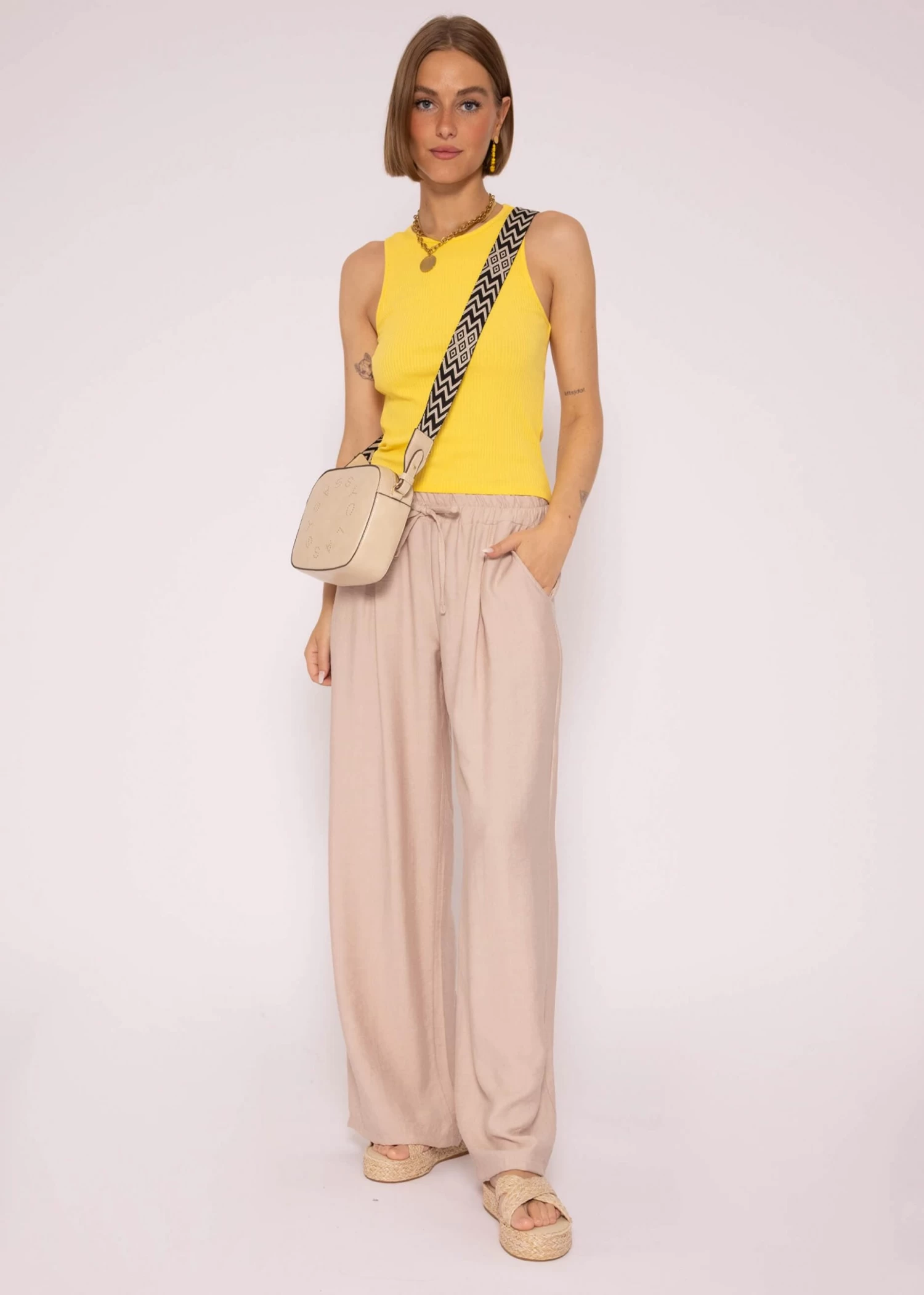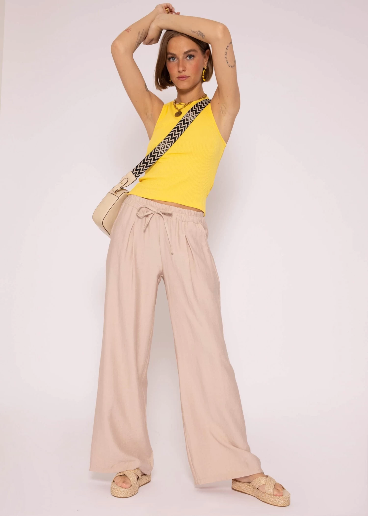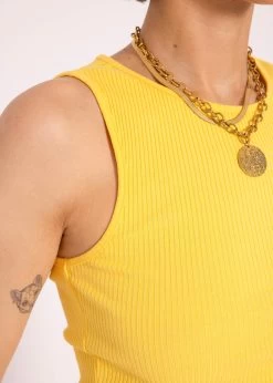 Rip Jersey Top in Gelb. Das Modell besitzt einen hohen Rundhalsausschnitt, ein ärmelloses Design und eine enganliegende Passform. Stilsicherheit und Einfachheit vereinen sich in diesem Top. Ob als Solo-Piece oder als Unterzieher zum Kombinieren unter einem Pullover, Blazer oder Cardigan, dieses Top ist multifunktional einsetzbar. Gefertigt aus einem hochwertigen, soften und elastischen Baumwoll Rip Jersey, bietet es höchsten Tragekomfort. Das Top verfügt über einen geraden Saumabschluss und einen etwas tieferen, angesagten Armausschnitt.