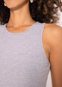 Rip Jersey Top in Grau. Das Modell besitzt einen hohen Rundhalsausschnitt, ein ärmelloses Design und eine enganliegende Passform. Stilsicherheit und Einfachheit vereinen sich in diesem Top. Ob als Solo-Piece oder als Unterzieher zum Kombinieren unter einem Pullover, Blazer oder Cardigan, dieses Top ist multifunktional einsetzbar. Gefertigt aus einem hochwertigen, soften und elastischen Baumwoll Rip Jersey, bietet es höchsten Tragekomfort. Das Top verfügt über einen geraden Saumabschluss und einen etwas tieferen, angesagten Armausschnitt.