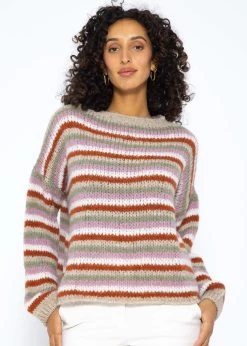 Verleihe deinem Kleiderschrank eine Prise fröhlicher Farben sowie ultimativen Komfort mit diesem vielseitigen Strickpullover. Das Modell ist in einer lockeren Oversize-Passform geschnitten, die für einen modernen Look sorgt. Die überschnittenen Schultern tragen zu einem lässigen Touch bei. Augenmerk bilden die Ringelstreifen in verschiedenen Farben, die dem Pullover ein lebhaftes, angesagtes Erscheinungsbild verleihen. Er kann wunderbar mit Jeans, Leggings oder Röcken kombiniert werden.