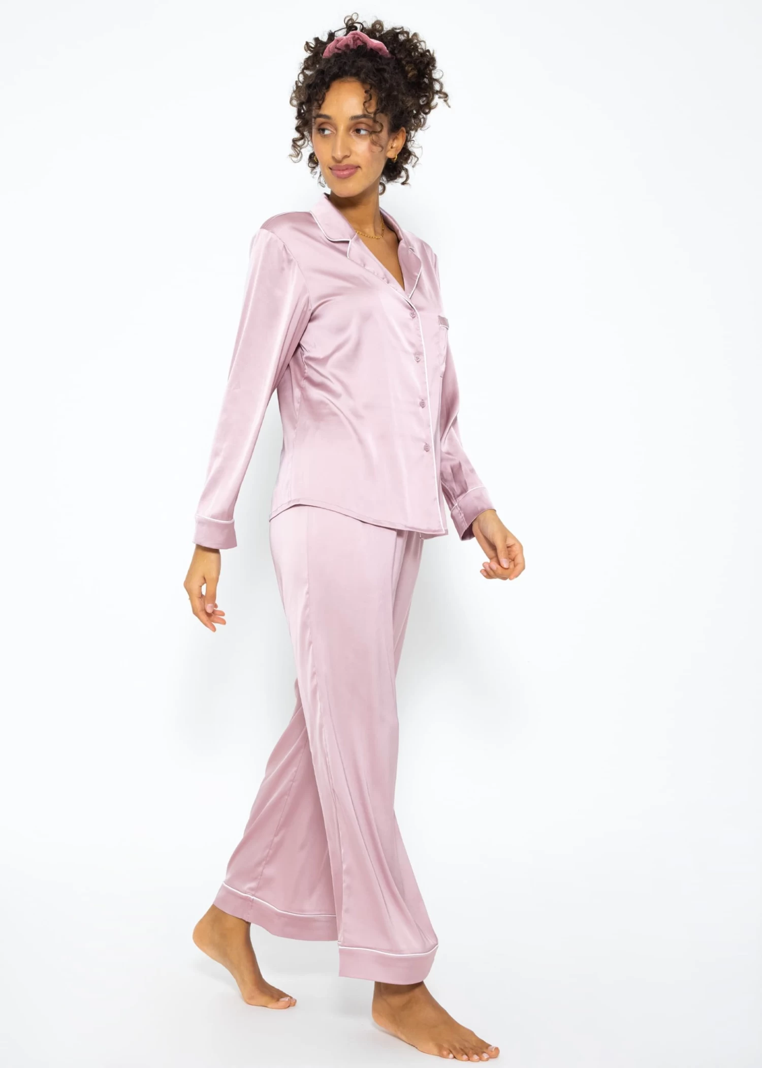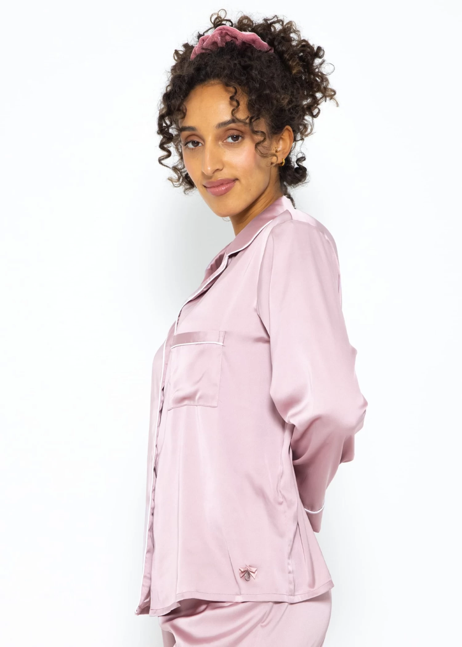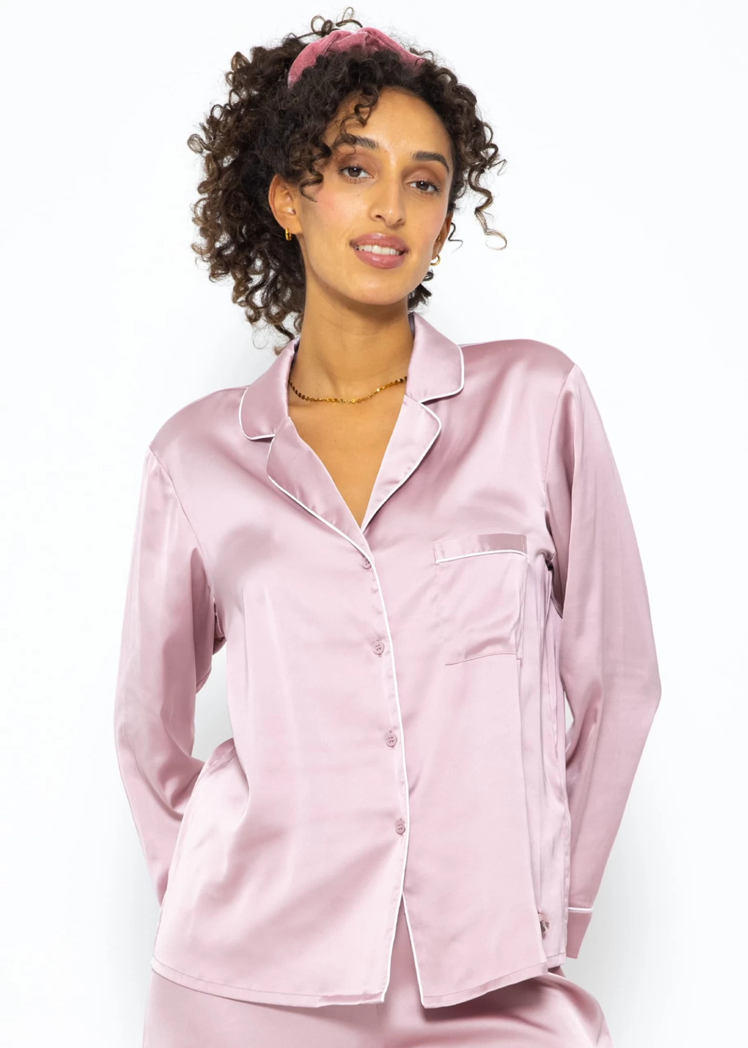 Tauche ein in puren Luxus und höchsten Komfort mit unserer exquisiten Pyjamabluse aus Satin. Die lockere Passform schenkt dir Bewegungsfreiheit und ein angenehmes Tragegefühl, während die feine Paspelverzierung dem Design eine subtile Raffinesse verleiht. Das Modell besitzt eine durchgehende Knopfleiste, einen stilvollen Kragen sowie eine Brusttasche, die für ein elegantes Gesamtbild der Satinbluse sorgen. Die kleine SASSYCLASSY Logo Schleife rundet das Design gekonnt ab. Verwöhne dich selbst mit diesem zeitlosen Teil, das kombinierbar mit der dazu passenden kurzen oder langen Satinhose ist.