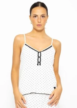 Erlebe süße Träume in diesem entzückenden Schlaftop in lockerer Passform. Das verspielte Pünktchenmuster verleiht diesem Top einen charmanten und femininen Touch, während der gewellte Saumabschluss für Raffinesse sorgt. Die verstellbaren Spaghettiträger ermöglichen eine individuelle Anpassung. Der Ausschnitt des Tops ist mit zarter Spitze verziert, die nicht nur einen Hauch von Eleganz verleiht, sondern auch das Dekolleté auf subtile Weise betont. Die gebrandete Schleife am Saum setzt einen eleganten Akzent und unterstreicht die hochwertige Verarbeitung. Hergestellt aus angenehmem Material bietet dieser Schlaftop höchsten Tragekomfort während deiner nächtlichen Ruhephasen.