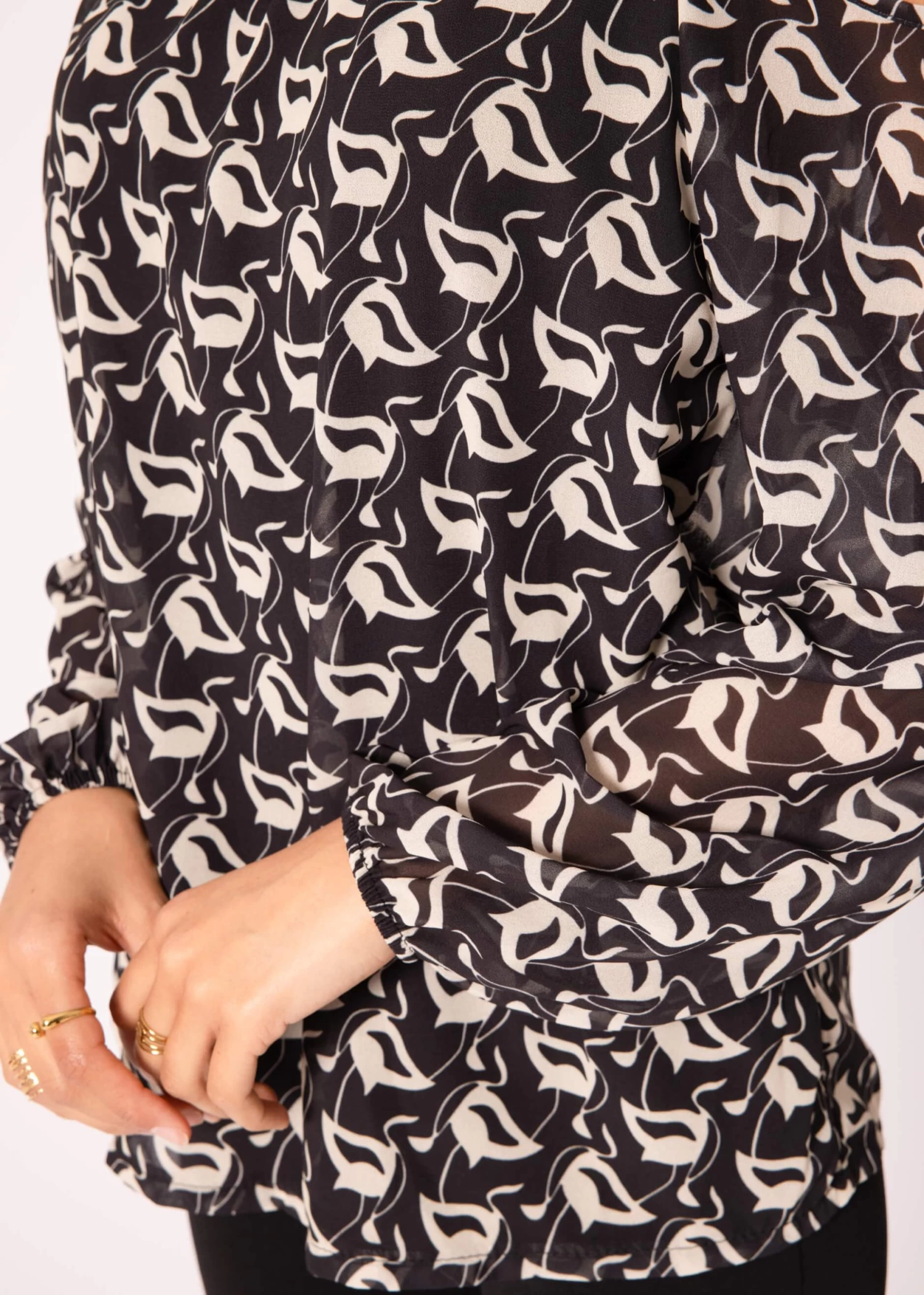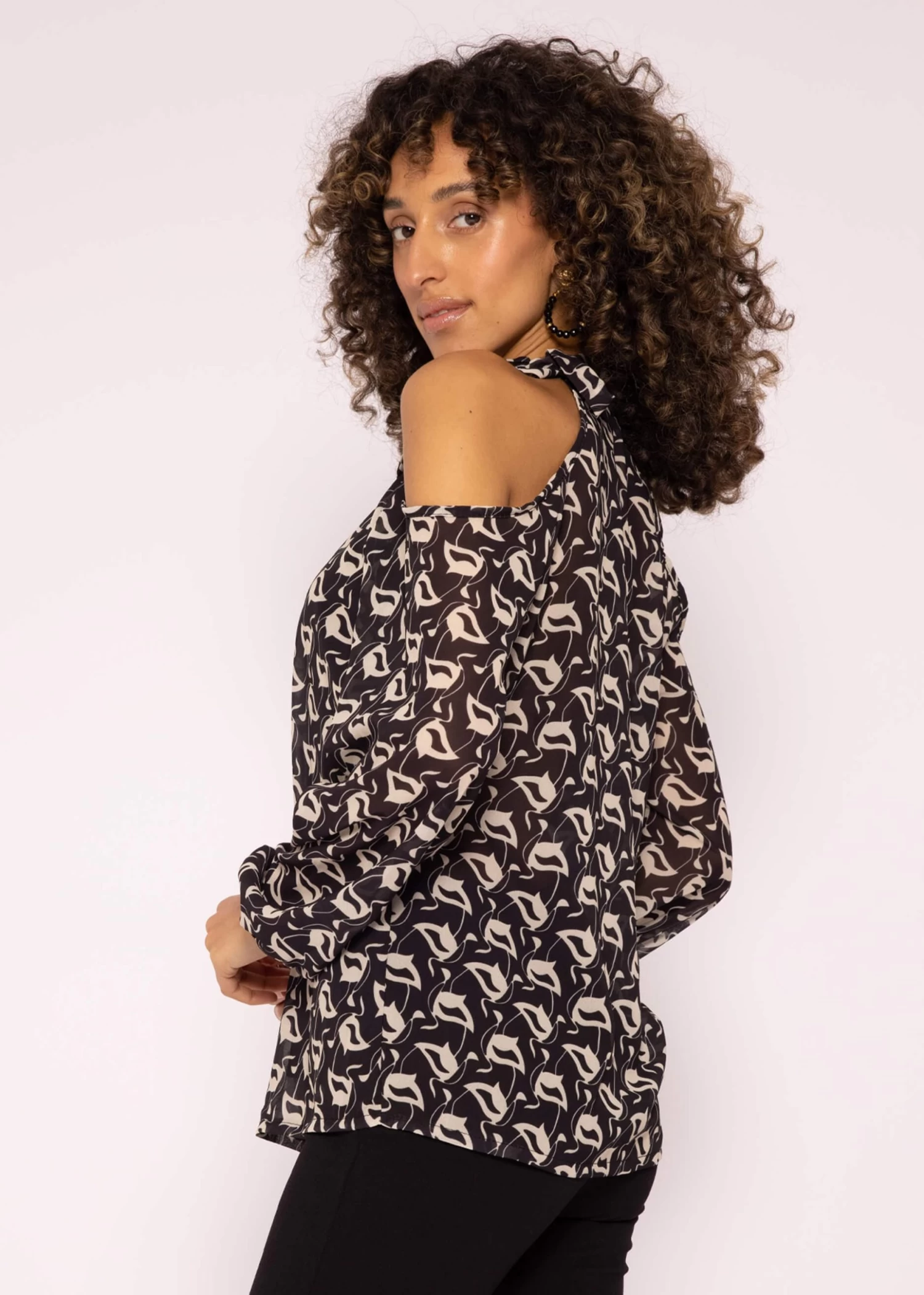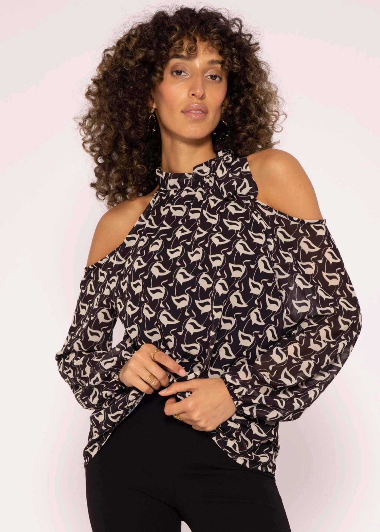 Diese wunderschöne Chiffonbluse kommt in einem modischen, schulterfreien Design und Oversized-Fit. Das Modell besitzt lange Ärmel, die mit Gummizug abschließen sowie einen Neckholderausschnitt, der individuell gebunden werden kann. Während die Ärmel und die Rückenseite leicht transparent gehalten sind, ist die Vorderseite gefüttert, damit ein sicheres Tragegefühl garantiert werden kann. Der All-Over Print sorgt für ein elegantes Design. Stylingtipp: Trage die Bluse zum passenden Rock für einen schicken Ausgehlook.