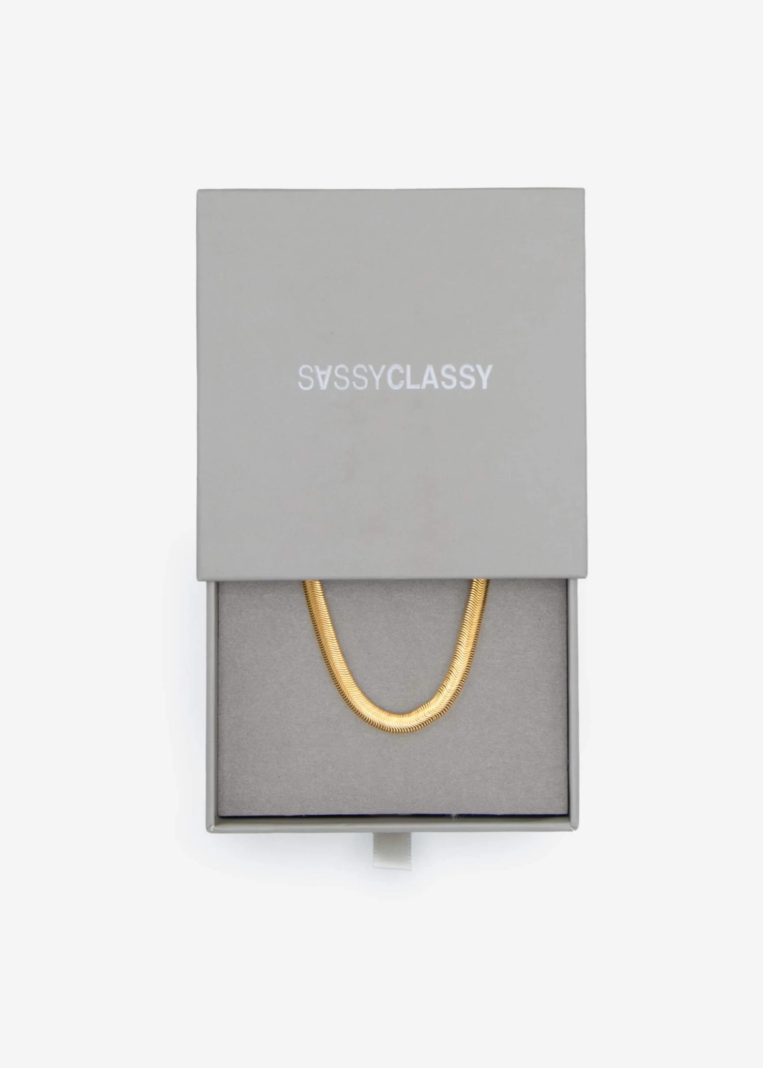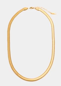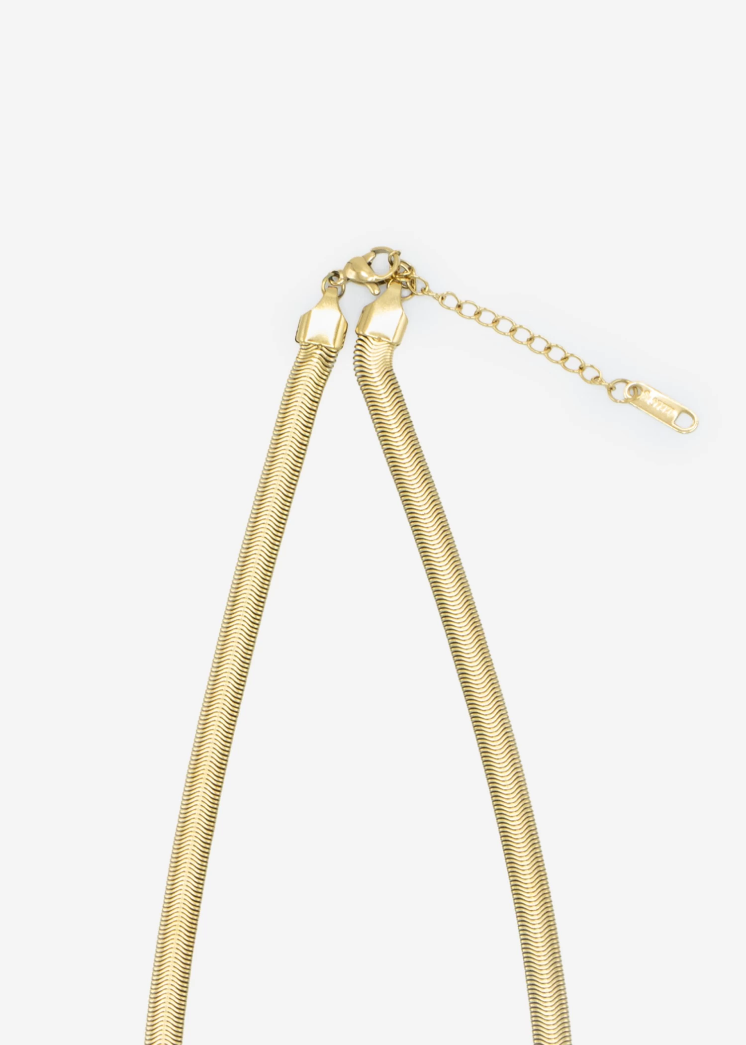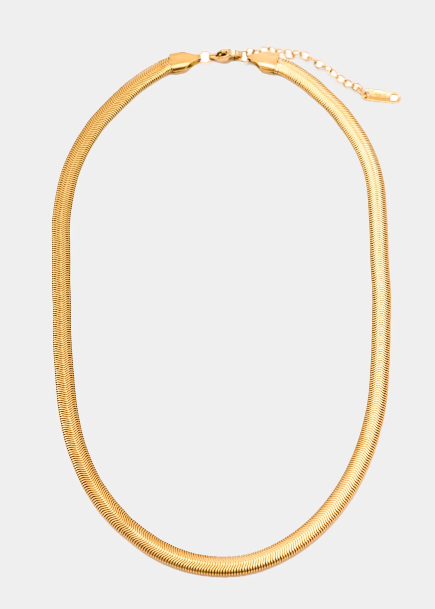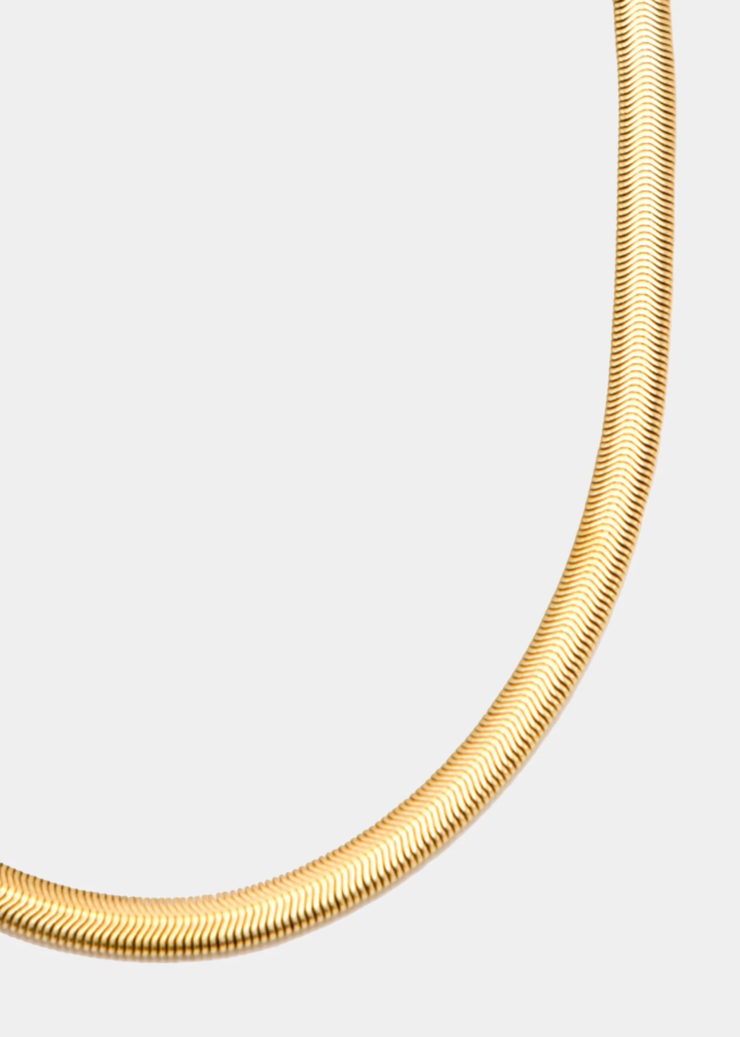 Diese flache Snake Chain ist elegant und chunky zugleich, was sie zu einem total angesagtes Must-Have macht. Sie legt sich perfekt um deinen Hals und besticht durch ihre schimmernde, schlangenartige Optik, die durch die enggewobenen Kettenglieder entsteht. Die Kette rundet dein Outfit ab und sorgt für einen letzten Glam-Touch. Sie ist längenverstellbar.