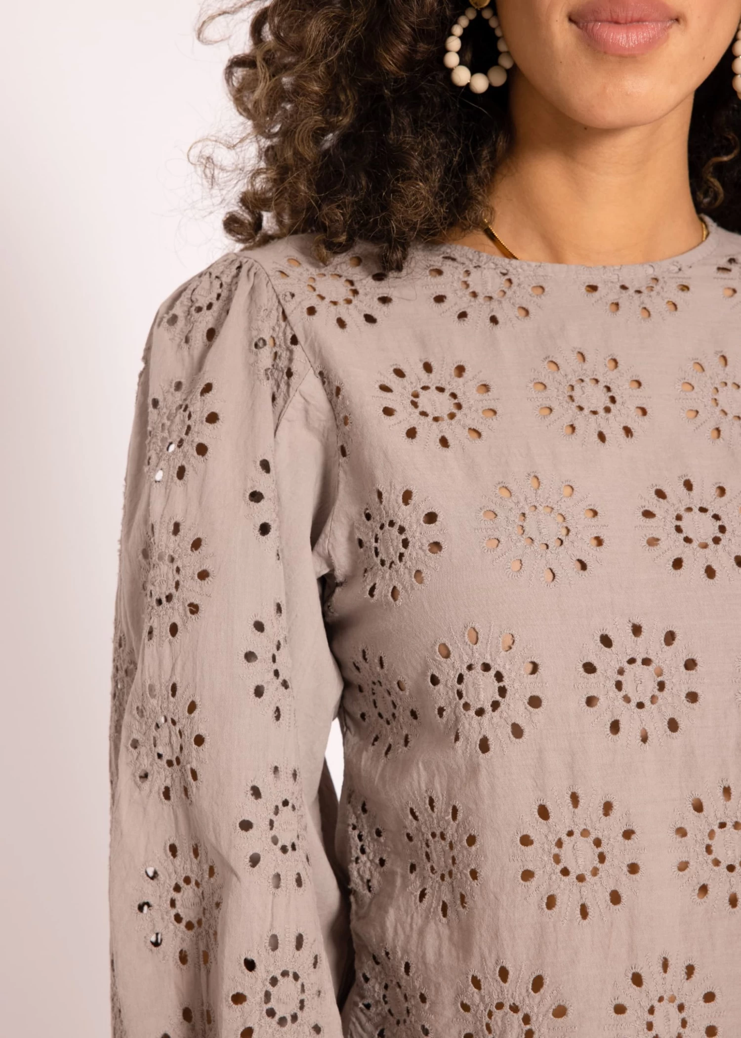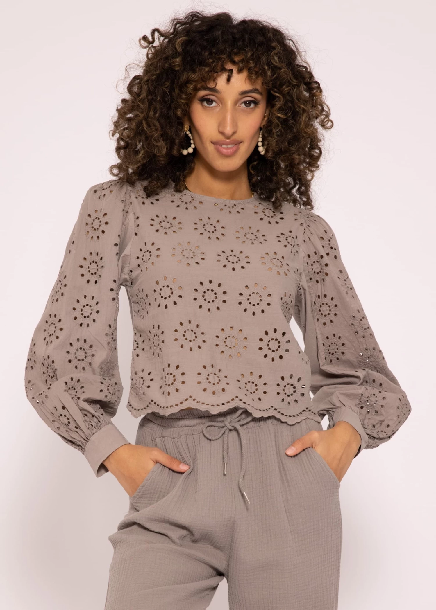 Spitzen Blusentop in Taupe. Dieses Modell aus reiner Baumwolle besitzt einen Rundhalsausschnitt, Rückenschlitz mit Knopf sowie Manschetten an den langen Ärmeln. Sie präsentiert sich in einem lockeren Regular-Fit und voluminösen Ballonärmeln. Die Vorderseite des Blusentops sowie die obere Hälfte des Ärmels sind mit schöner Spitze verziert, wodurch sie zu einem eleganten Statement-Piece wird. Die Bogenkante am Saum rundet das Design ab und verleiht der Bluse süße Details. Du kannst dieses Kleidungsstück zu all deinen im Kleiderschrank bestehenden Hosen kombinieren. Für den Alltag als auch für einen feierlichen Anlass lässt es sich perfekt stylen.