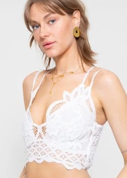 Dieses atemberaubende Spitzen-Bustier strahlt klassische Eleganz mit einem Hauch von Verführung aus. Highlight bildet das Design aus floraler Spitze und geometrischen Elementen, die Romantik und modernen Stil vereinen. Eine breite Spitzenbordüre unter der Brust sorgt für eine schmeichelhafte Silhouette, während der anliegende Schnitt und die Cropped Länge, deine Figur betonen. Das Modell besitzt schmale, verstellbare Träger, die gekreuzt am Rücken angeordnet sind, und eine individuelle Passform ermöglichen.