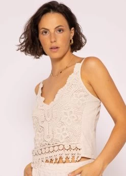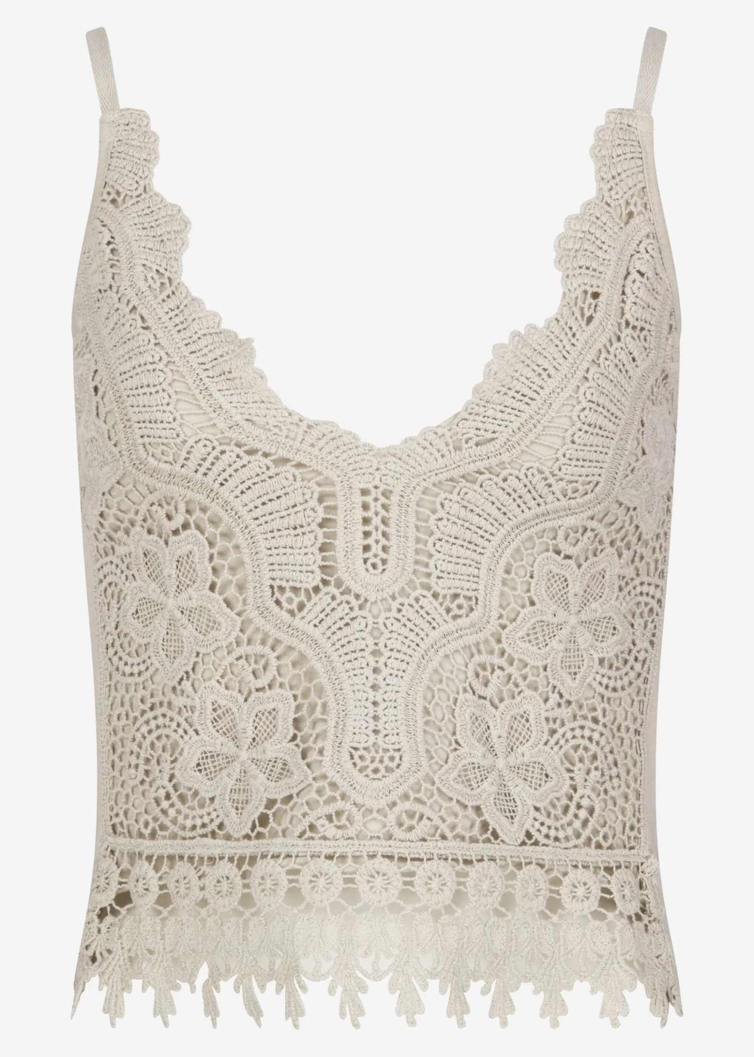 Vorne gefüttertes Top aus attraktiver Spitze mit verstellbaren Spaghettiträgern. Es hat einen tiefen V-Ausschnitt und das Rückenteil ist aus Jersey.