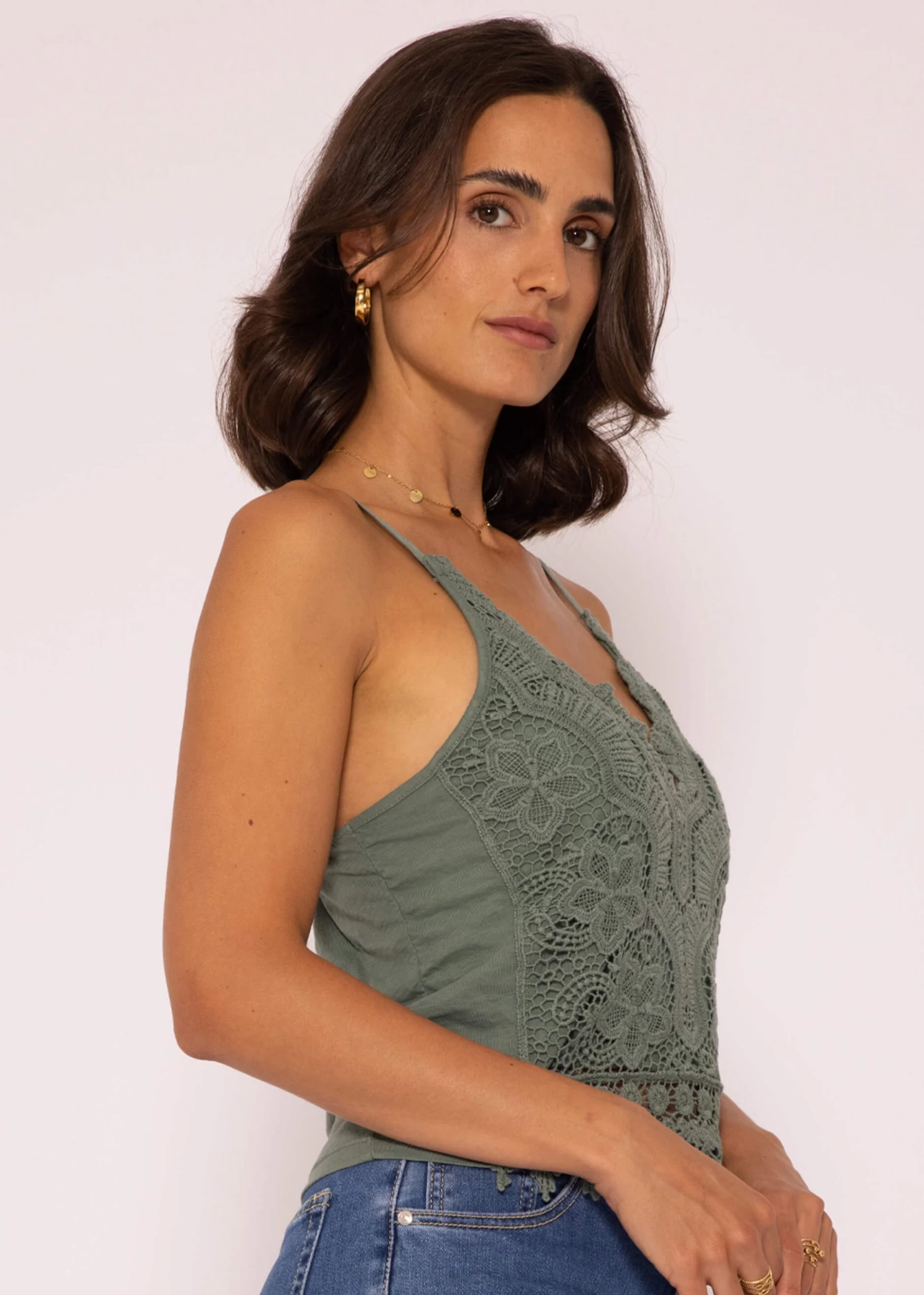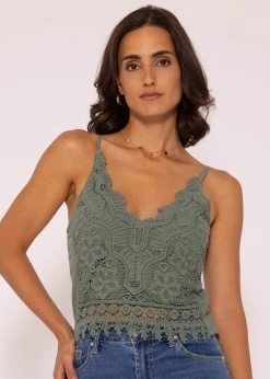 Top aus attraktiver Spitze mit tiefem V-Ausschnitt. Es ist vorne gefüttert und die Spaghettiträger sind verstellbar. Das Rückenteil ist aus Jersey.