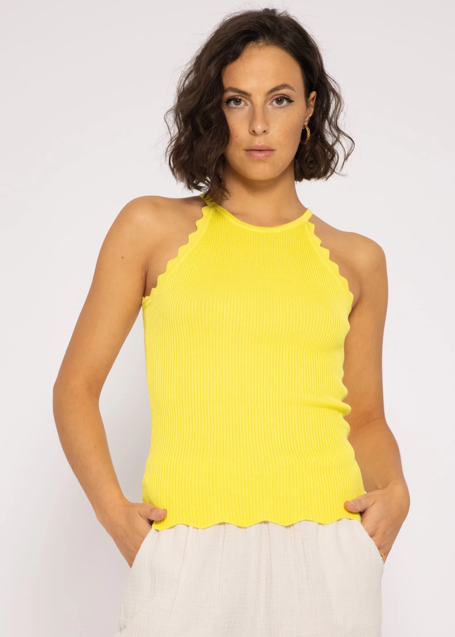 Feines Strick Top in Viskose Rip. Bogenkanten am Armausschnitt und Saum geben dem Sommer-Top eine feminine Note.