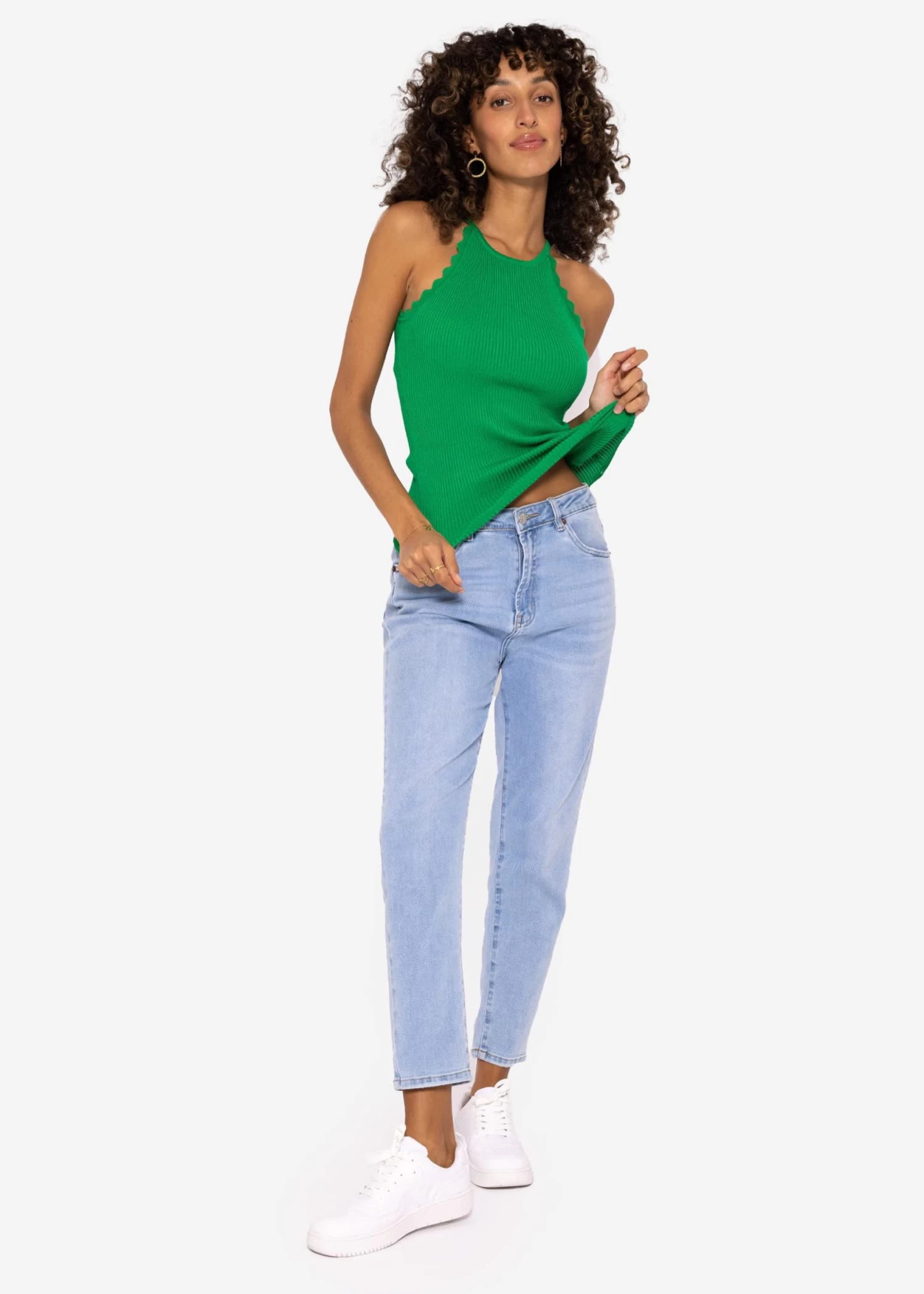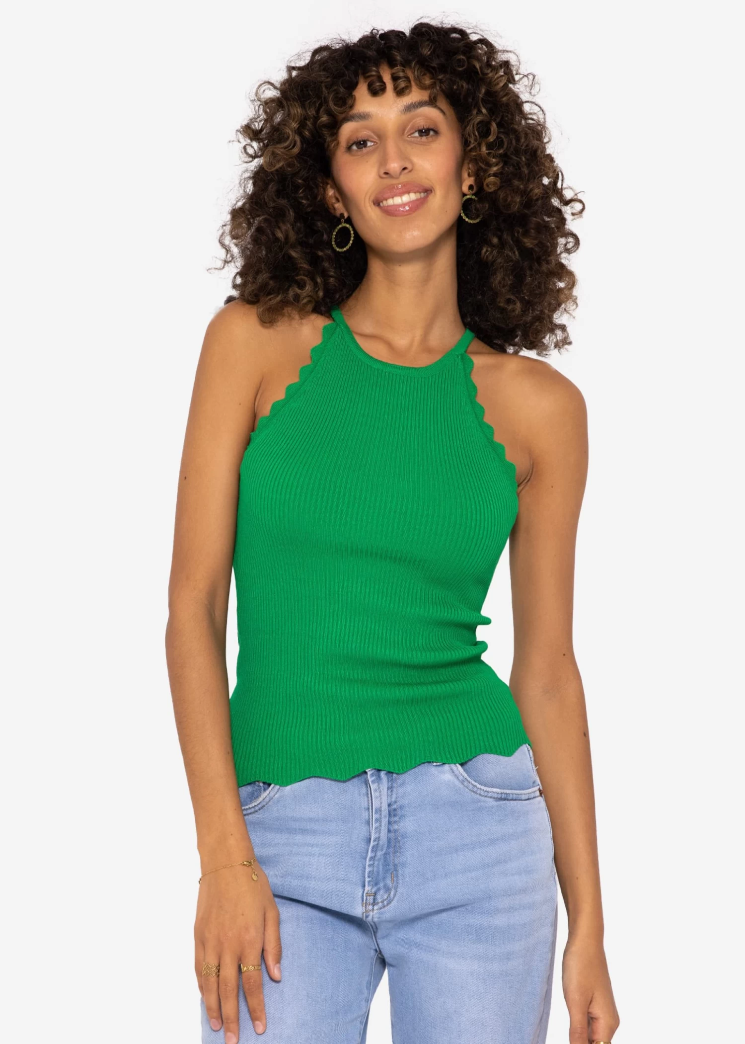 Feines Strick Top in Viskose Rip. Bogenkanten am Armausschnitt und Saum geben dem Sommer-Top eine feminine Note.
