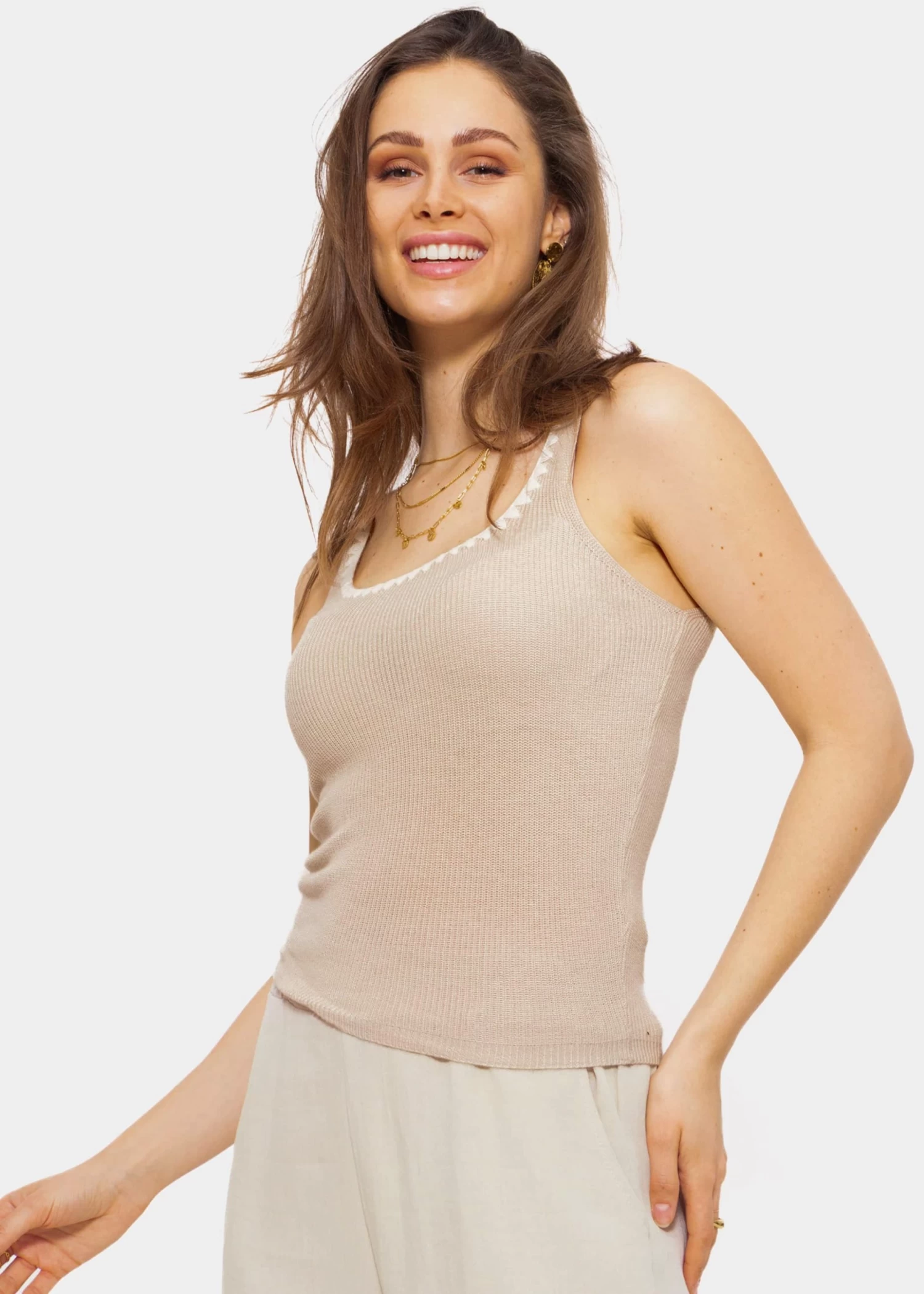 Stricktops sind vor allem im Sommer mit leichtem Rock oder cooler Jeans ein absolutes Must-Have. Dieses Modell in Beige mit Bordüre besitzt ein ärmelloses Design, eine anliegende Passform sowie einen gerippten Saumabschluss. Ein tiefer Rundhals- sowie Rückenausschnitt verleihen dem Top ein verführerisches, feminines Design. Die weiße Bordüre am Ausschnitt gibt dem Top das gewisse Etwas und macht es zum Hingucker. Es wurde aus einem angenehmen, elastischen Viskosegemisch gefertigt und trägt sich besonders weich auf der Haut.