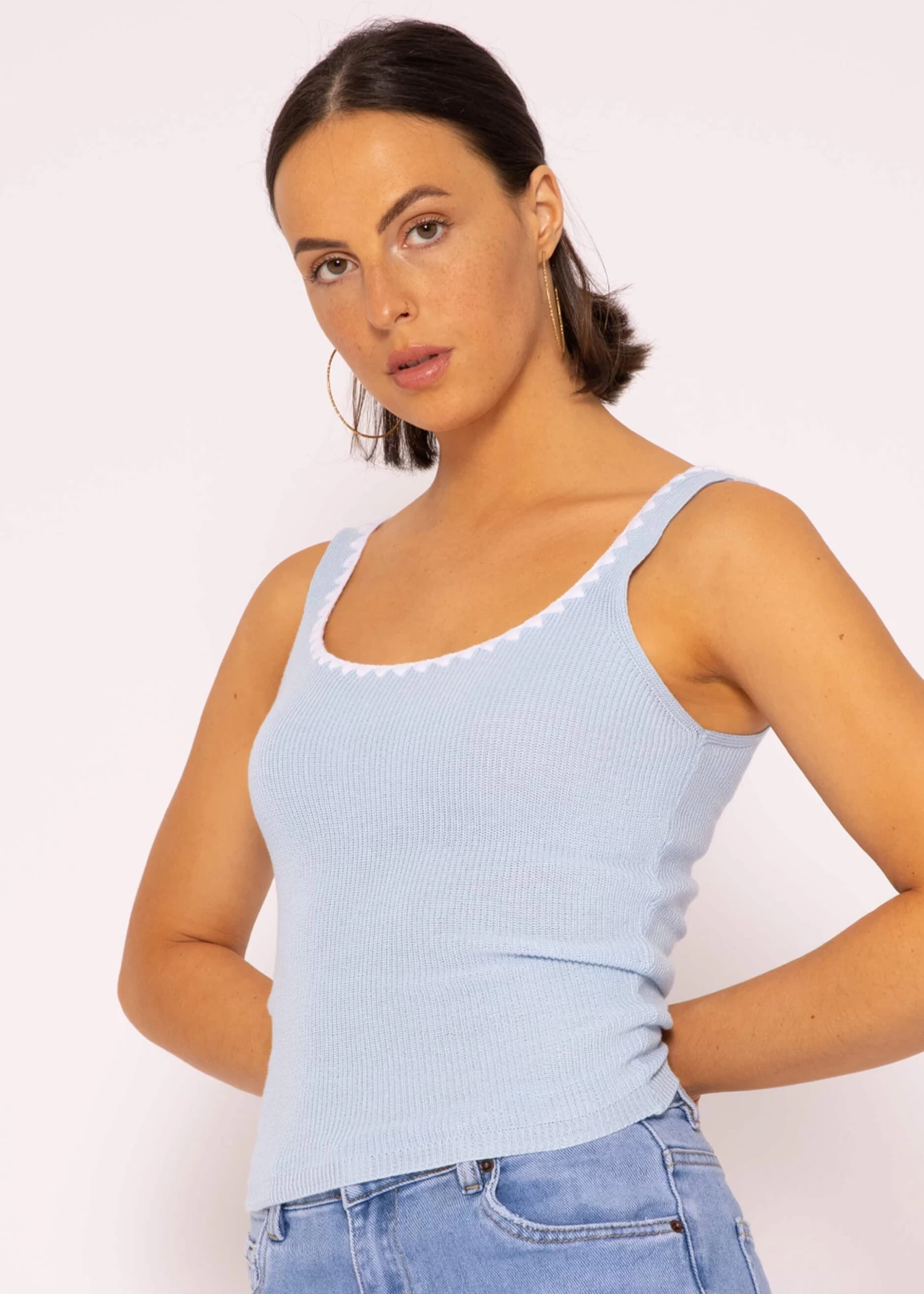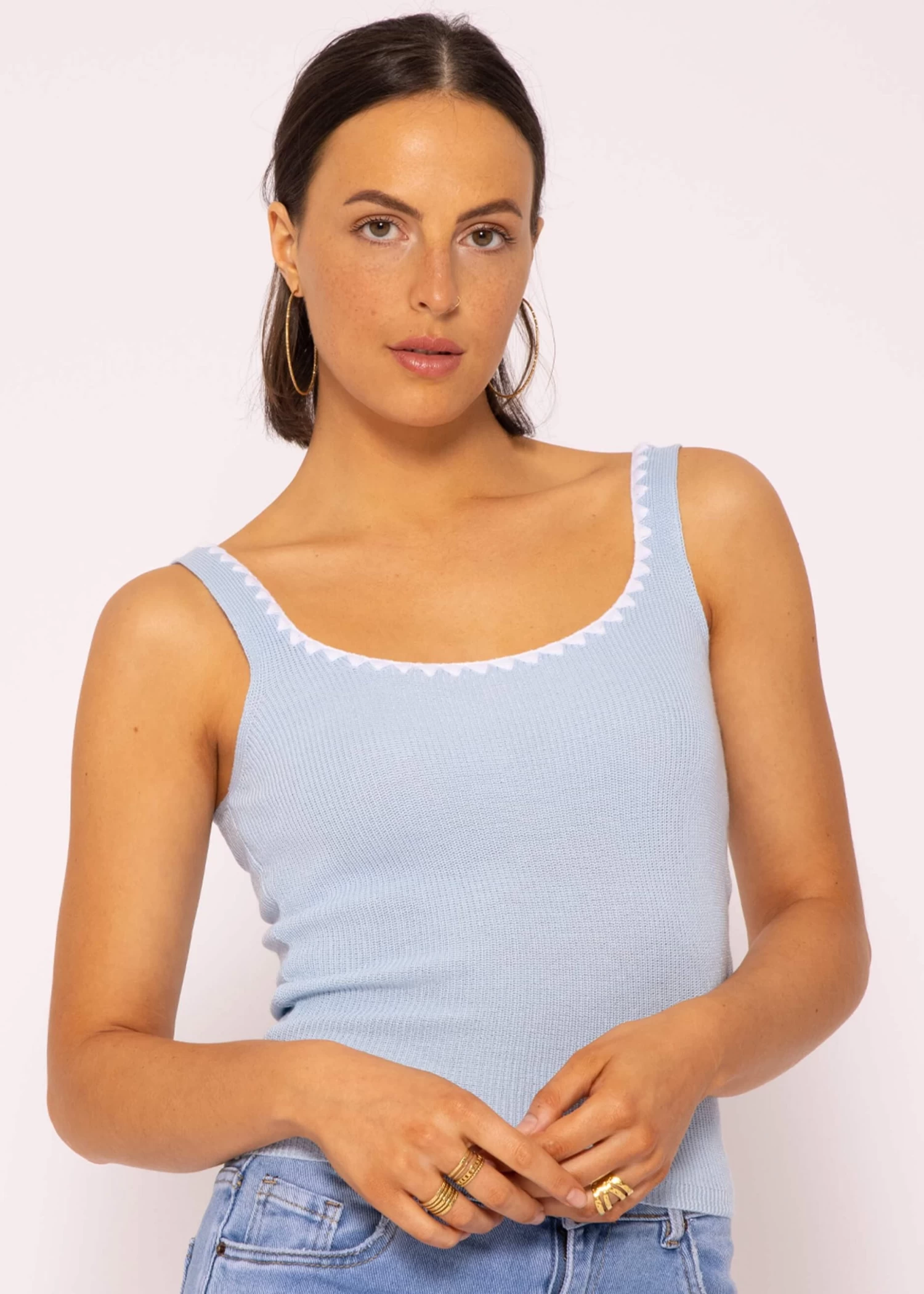 Stricktops sind vor allem im Sommer mit leichtem Rock oder cooler Jeans ein absolutes Must-Have. Dieses Modell in Hellblau mit Bordüre besitzt ein ärmelloses Design, eine anliegende Passform sowie einen gerippten Saumabschluss. Tiefer Rundhals- sowie Rückenausschnitt verleihen dem Top ein verführerisches, feminines Design. Die weiße Bordüre am Ausschnitt gibt dem Top das gewisse Etwas und macht es zum Hingucker. Das Top wurde aus einem angenehmen Viskosegemisch gefertigt und trägt sich besonders weich auf der Haut.