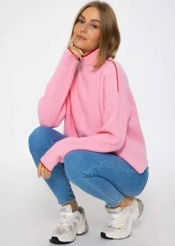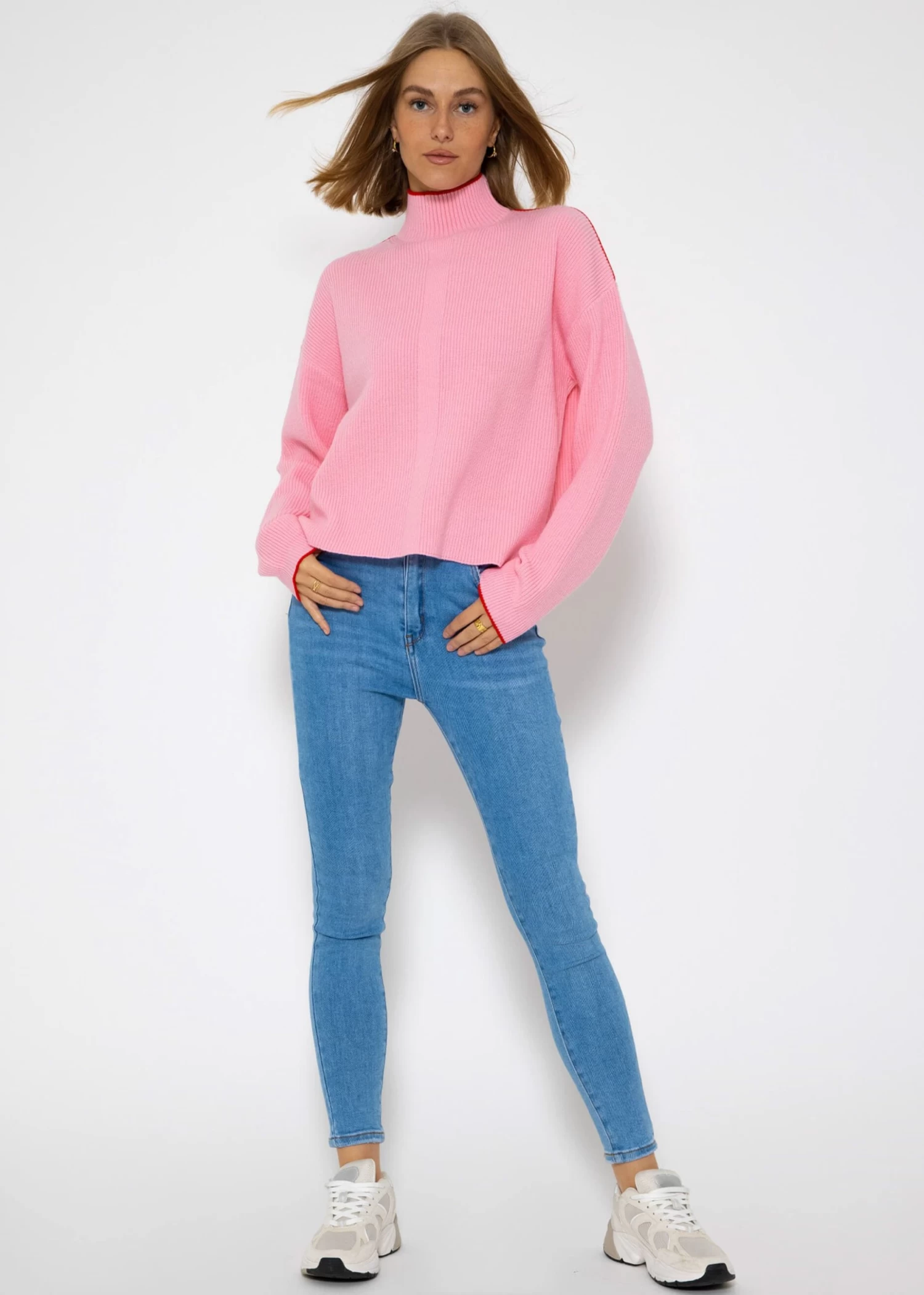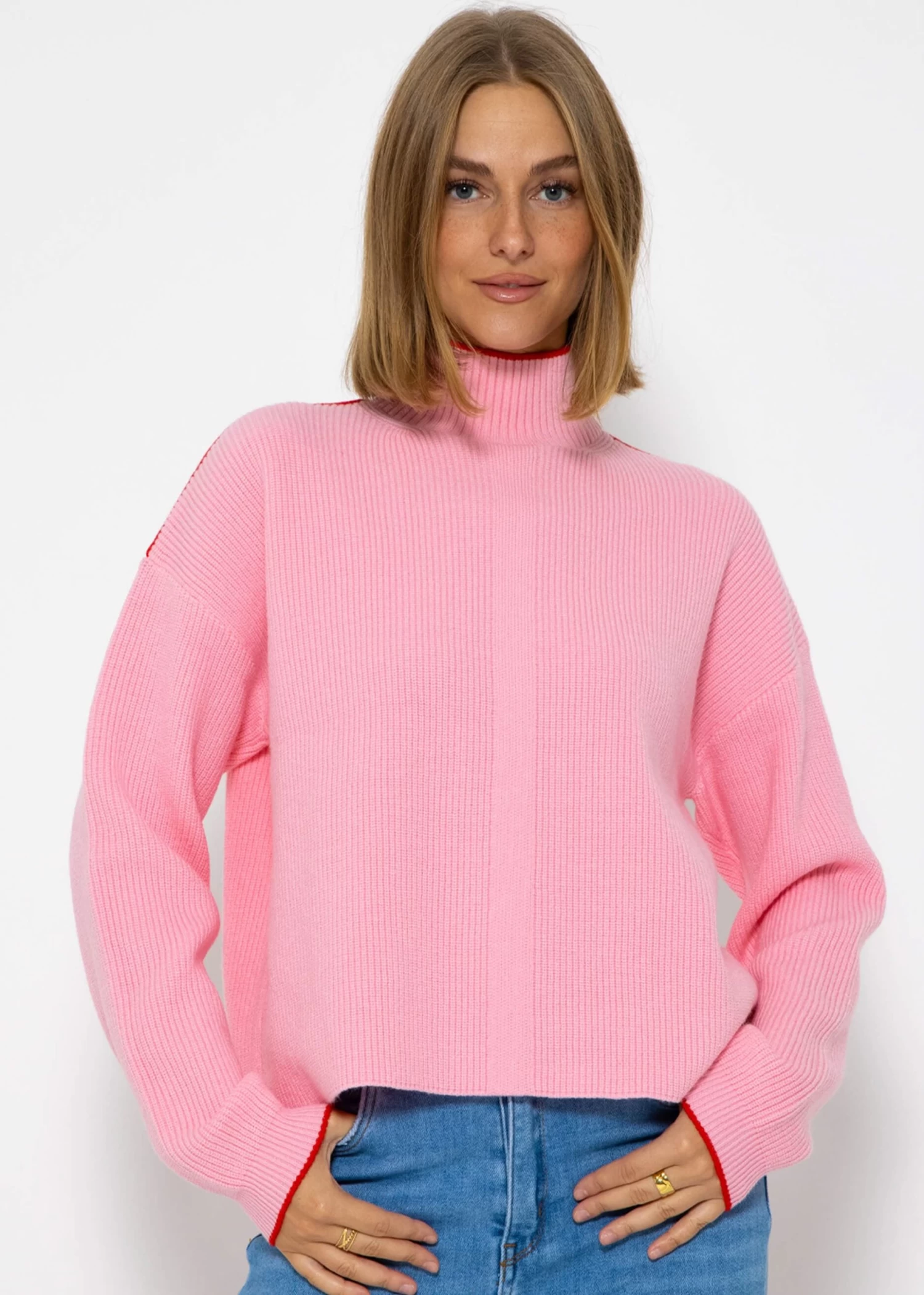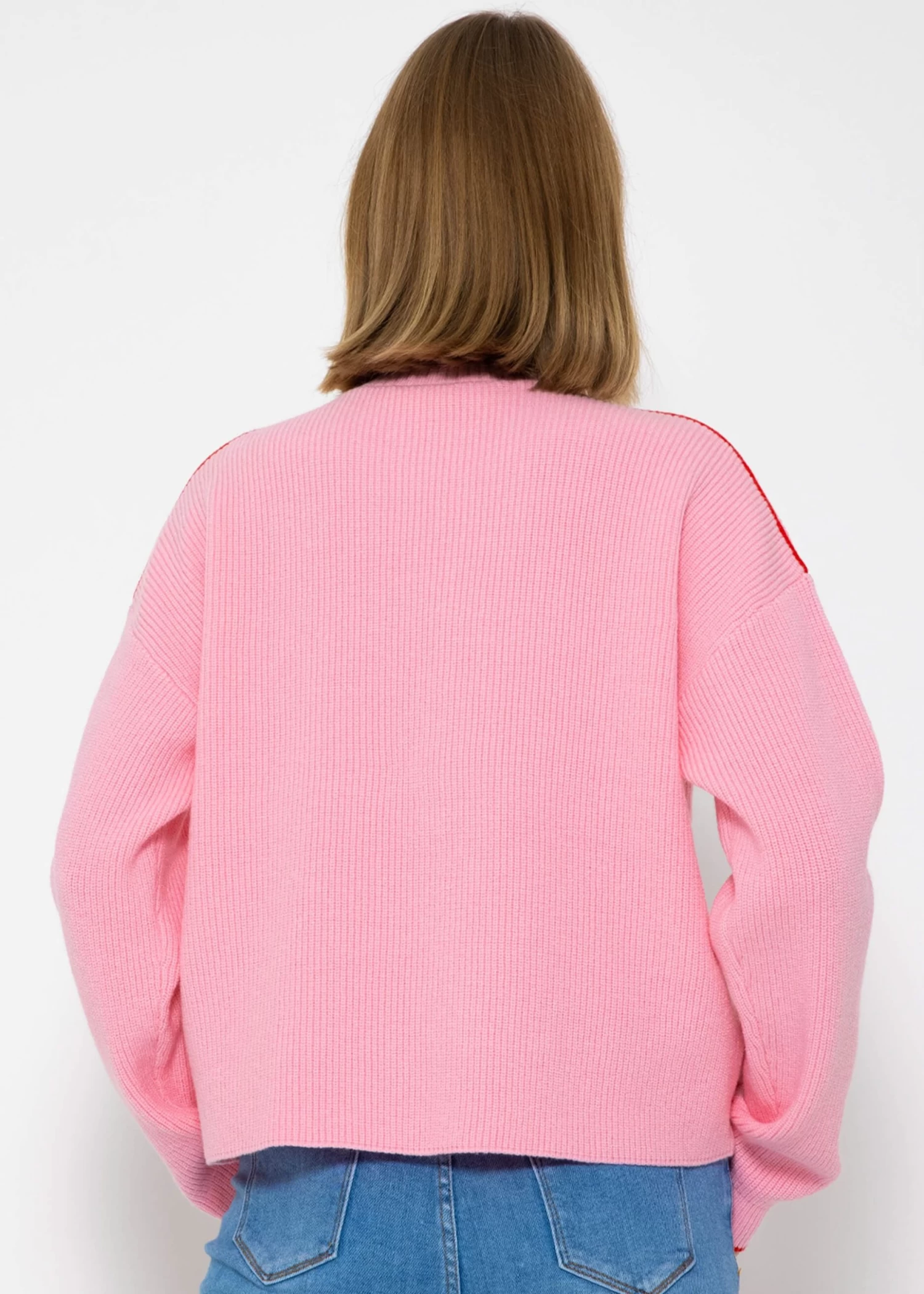 Strickpullover mit farbigen Akzenten in rosa-rot