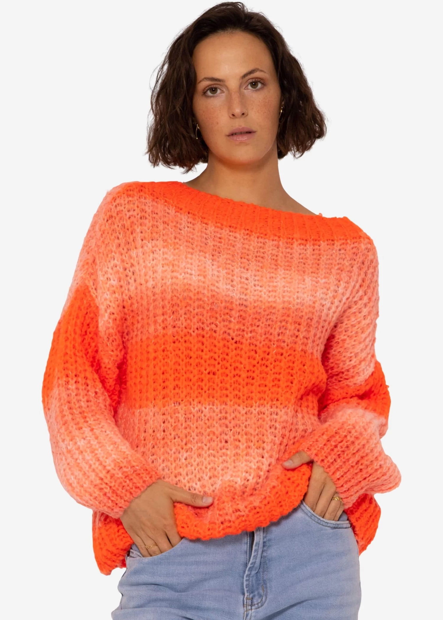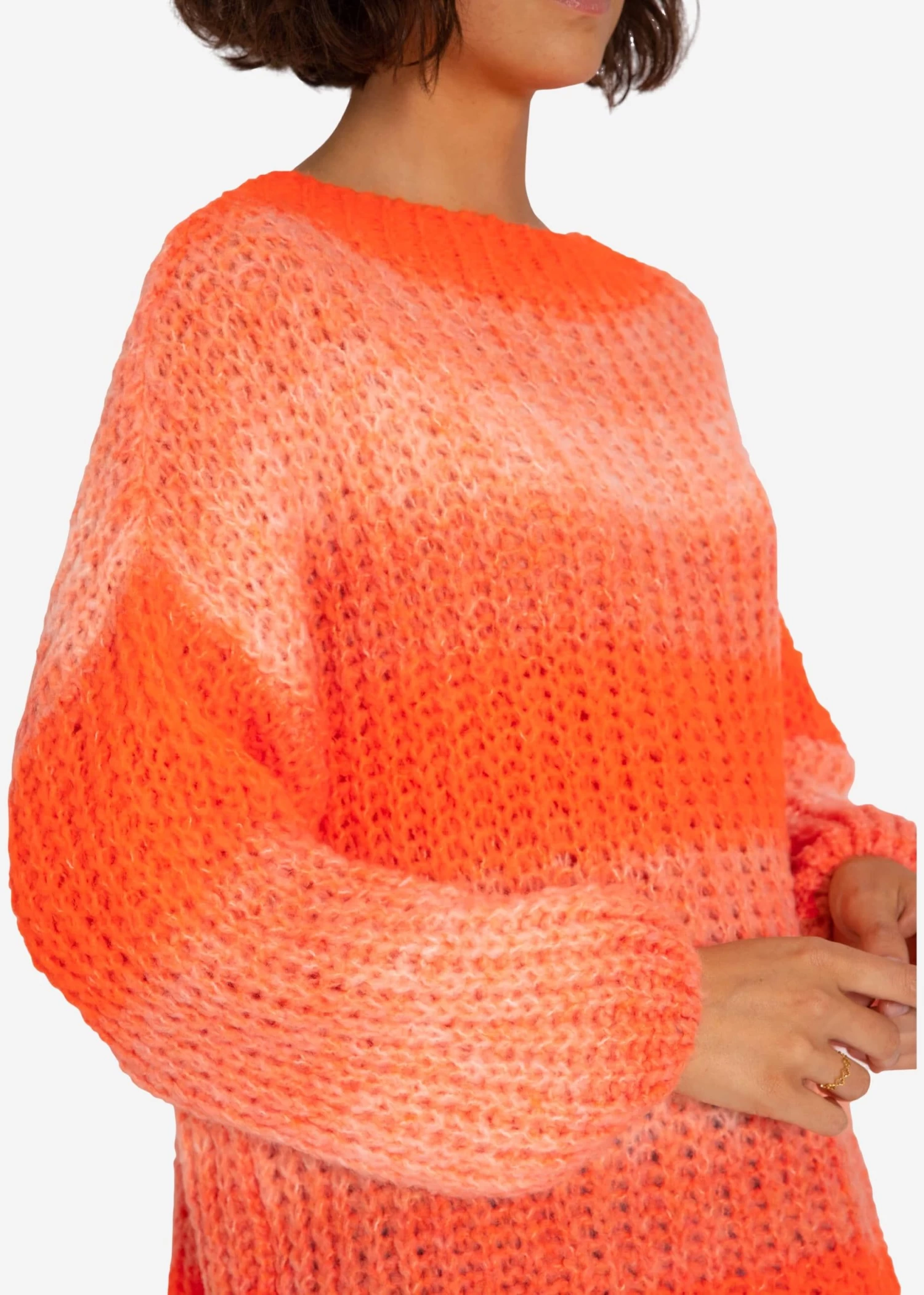 Dieser kuschelige Strickpullover bietet ein ultimatives Komforterlebnis, ohne dabei auf Stil zu verzichten. Highlight des Pullovers bildet der einzigartige Farbverlauf, der eine faszinierende Optik kreiert. Das subtile Zusammenspiel der Orangetöne sorgt für eine dynamische Ausstrahlung und verleiht deinem Outfit einen Hauch von Originalität. Das Modell präsentiert sich mit Rundhalsausschnitt, überschnittenen Schultern und in einer Oversized-Passform.