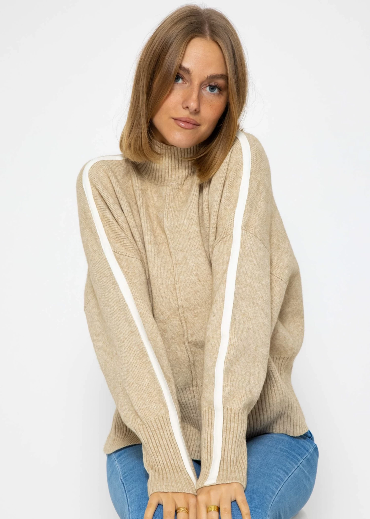 Erlebe ultimativen Komfort und zeitgenössischen Stil mit diesem modischen Strickpullover. Mit seiner großzügigen, lockeren Passform bietet er einen angesagten Look und hohen Tragekomfort. Der Rollkragen verleiht einen Hauch von Eleganz und hält dich an kühleren Tagen warm. Das Modell besitzt lange Ärmel, gerippte Abschlüsse und überschnittene Schultern. Highlight des Pullovers bilden die hellen Streifen an den Ärmeln, die einen trendigen Touch verleihen und ihn von herkömmlichen Strickpullovern abheben. Mittig der Vorderseite befindet sich eine längslaufende Naht, die dem Pullover Struktur verleiht und das Design gekonnt abrundet.
