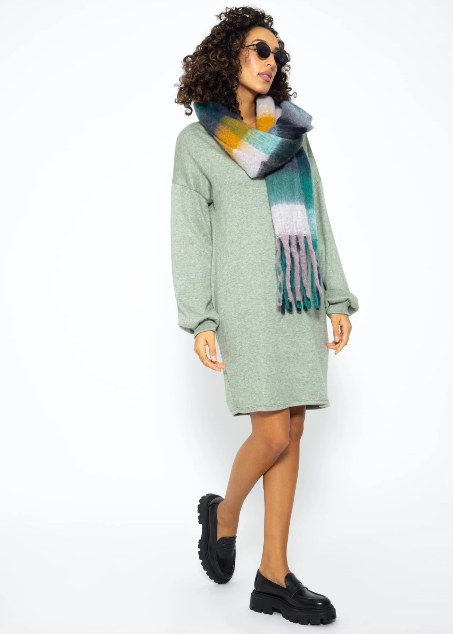 Dieses Kleid besteht aus einem hochwertigen Jersey-Material, das nicht nur unglaublich weich und flauschig ist, sondern auch ein besonders gemütliches Trageerlebnis verspricht. Die sorgfältig ausgewählte Stoffqualität schmiegt sich sanft an den Körper und verleiht dem Kleid eine luxuriöse Haptik. Das Modell präsentiert einen eleganten, etwas tiefer geschnittenen V-Ausschnitt mit einer ansprechenden Blende, die dem Kleid eine raffinierte Note verleiht. Die lockere Passform mit überschnittenen Schultern sorgt für eine lässige Eleganz, die den zeitgemäßen Look betont. Die langen Ärmel des Kleides schließen mit feinen Bündchen ab.