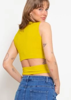 Dieses gerippte Top ist ein absolutes Sommer-Essential, das in deiner Garderobe nicht fehlen darf. Es wurde aus einem Viskosegemisch mit Stretch-Anteil gefertigt und besitzt eine enganliegende Passform, Rundhalsausschnitt sowie ein ärmelloses Design. Die Betonung liegt bei diesem Modell auf der Cut-Out Optik am Rücken, die dem Top das gewisse Etwas verleiht und alle Blicke auf sich zieht. Trage es zu einer schönen Wide Leg Pants oder einer coolen Paper Bag Shorts.