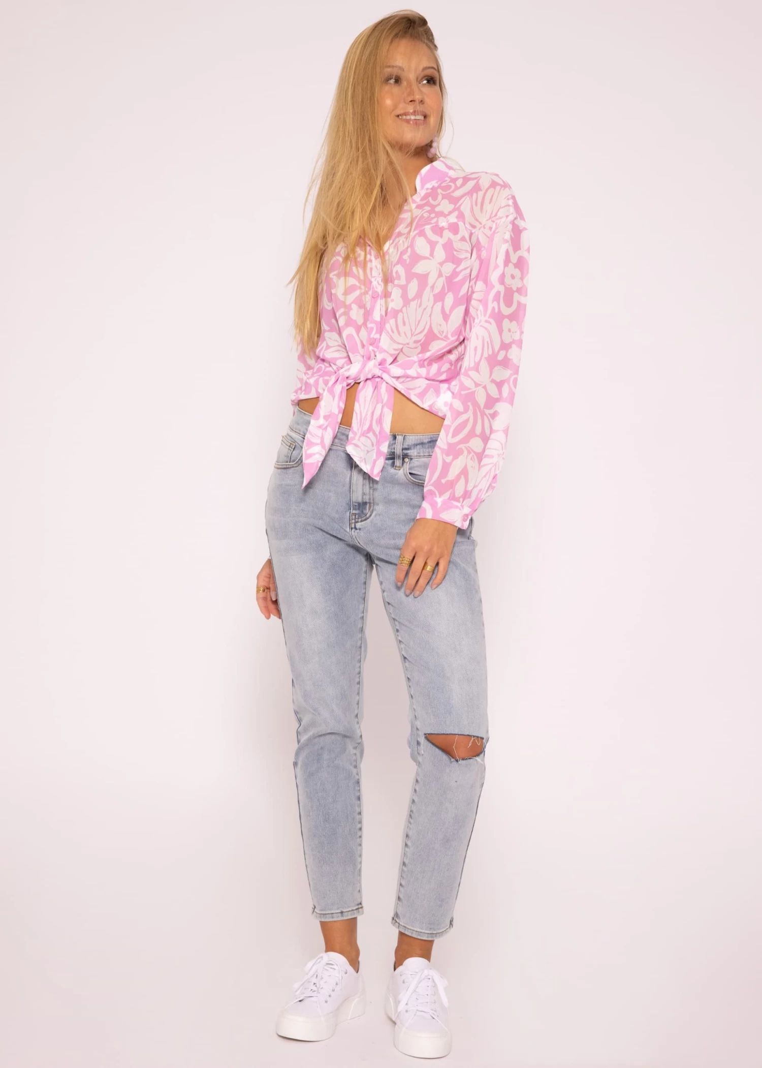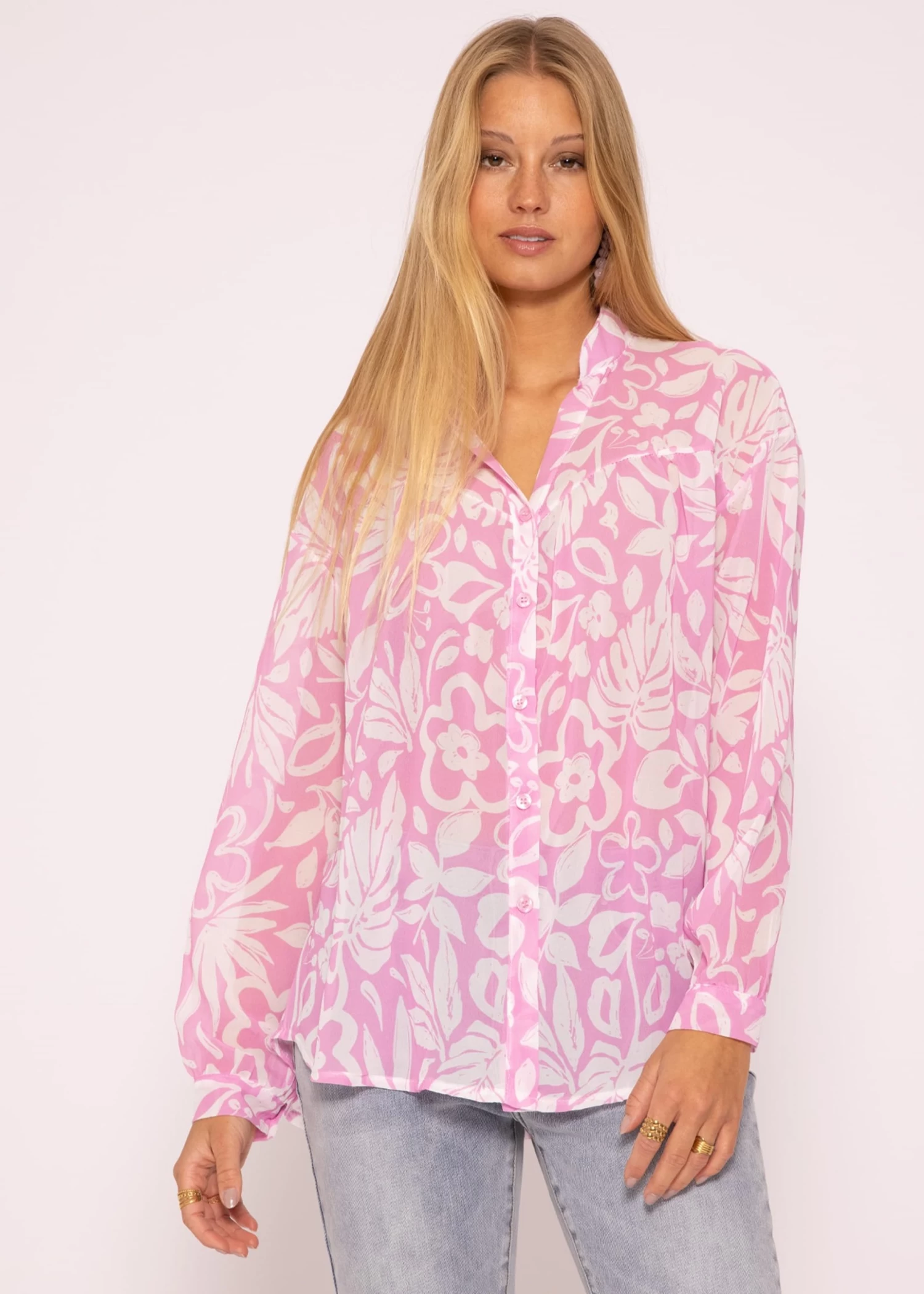 Transparente Bluse in Rosa/Weiß. Blusen mit floralem Print sind diesen Sommer echte Trendpieces. Das Modell hat einen schmalen Stehkragen, eine durchgehende Knopfleiste und elegante Manschetten mit Knopf an den langen Ärmeln. Der Oversized-Fit sowie die überschnittenen Schultern sorgen für ein luftiges, leichtes Design. Diese modern geschnittene Bluse verfügt über einen V-Ausschnitt, eine verlängerte Rückenpartie und einen abgerundeten Saumabschluss. Das allover Blumenmuster sowie die transparente Optik unterstreichen den femininen, verspielten Look. Hervorzuheben sind die liebevoll gebrandeten Knöpfe mit SASSYCLASSY Logo. Eine querlaufende Naht auf der Vorder- und Rückenseite verleiht der Bluse weitere Details. Trage sie klassisch als Bluse, offen über einem Top oder trendig geknotet mit tiefem Ausschnitt über einen schönen Spitzen-BH.