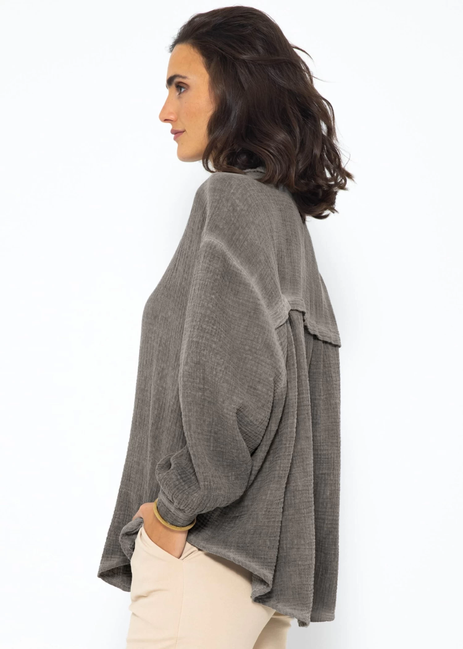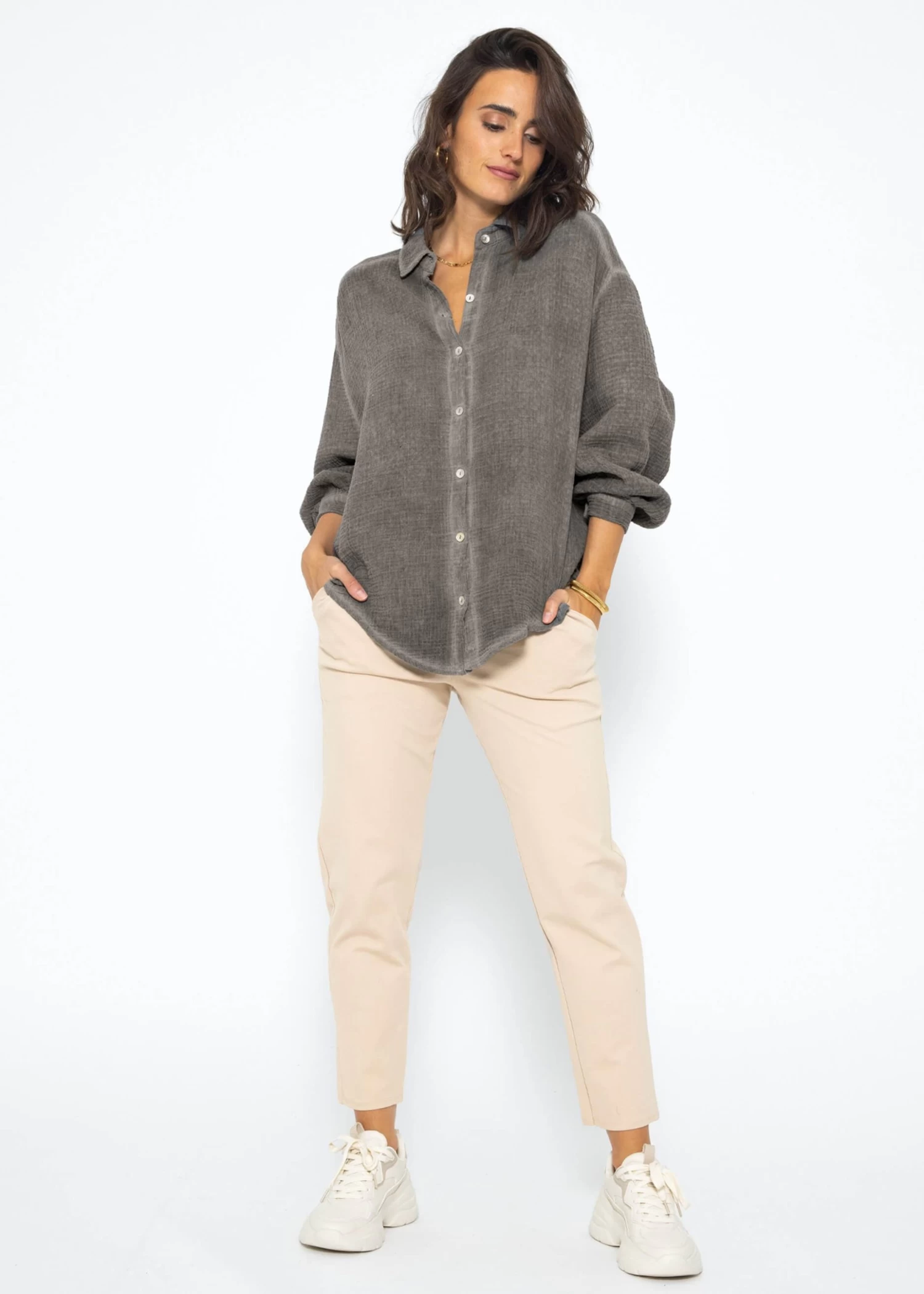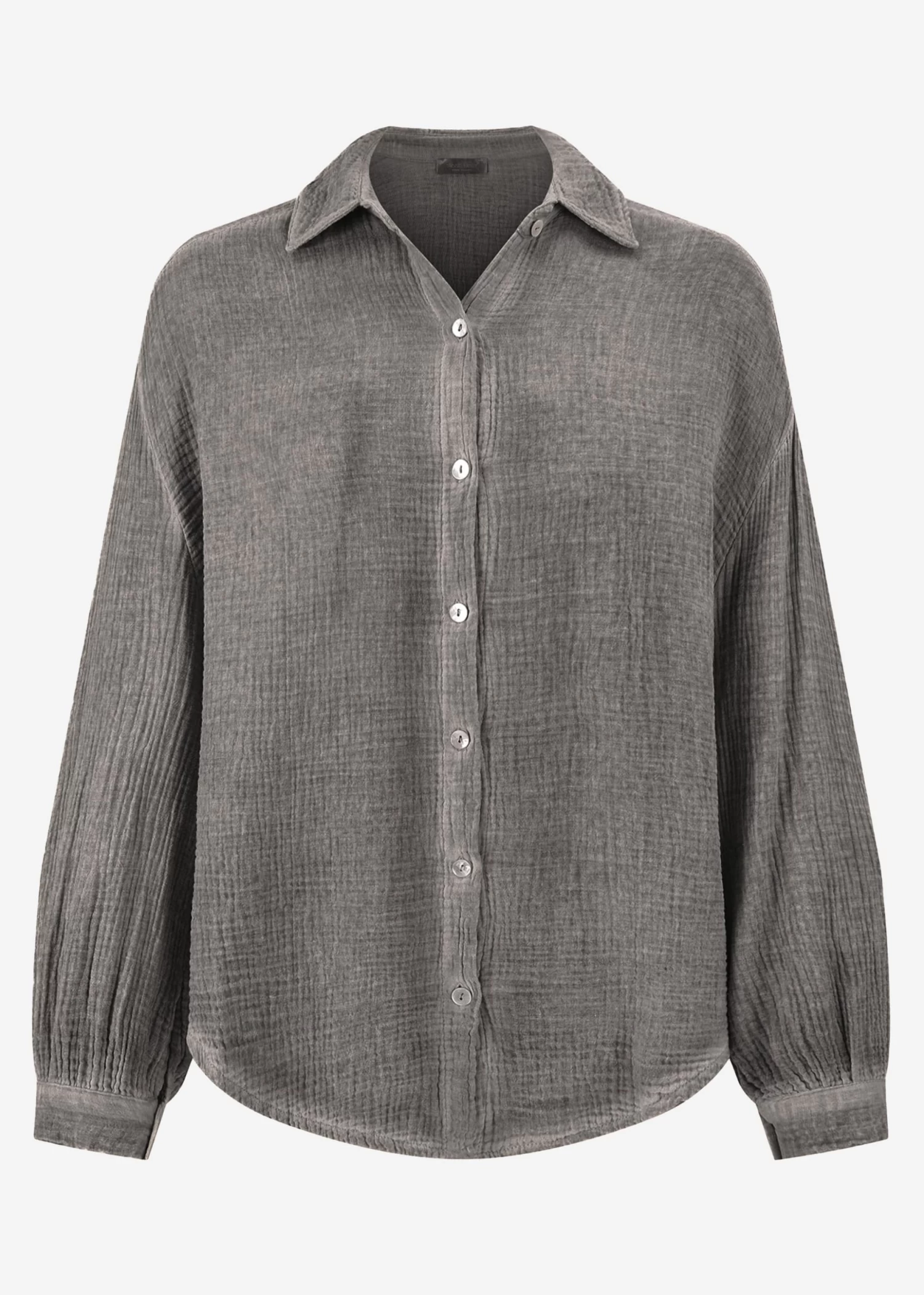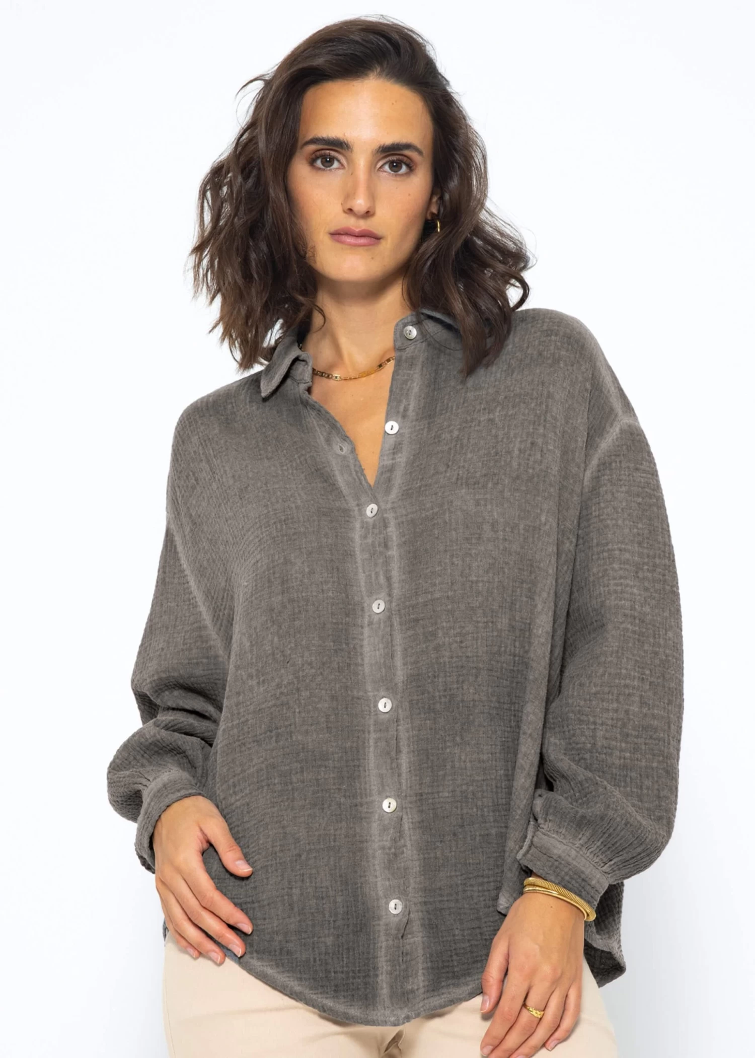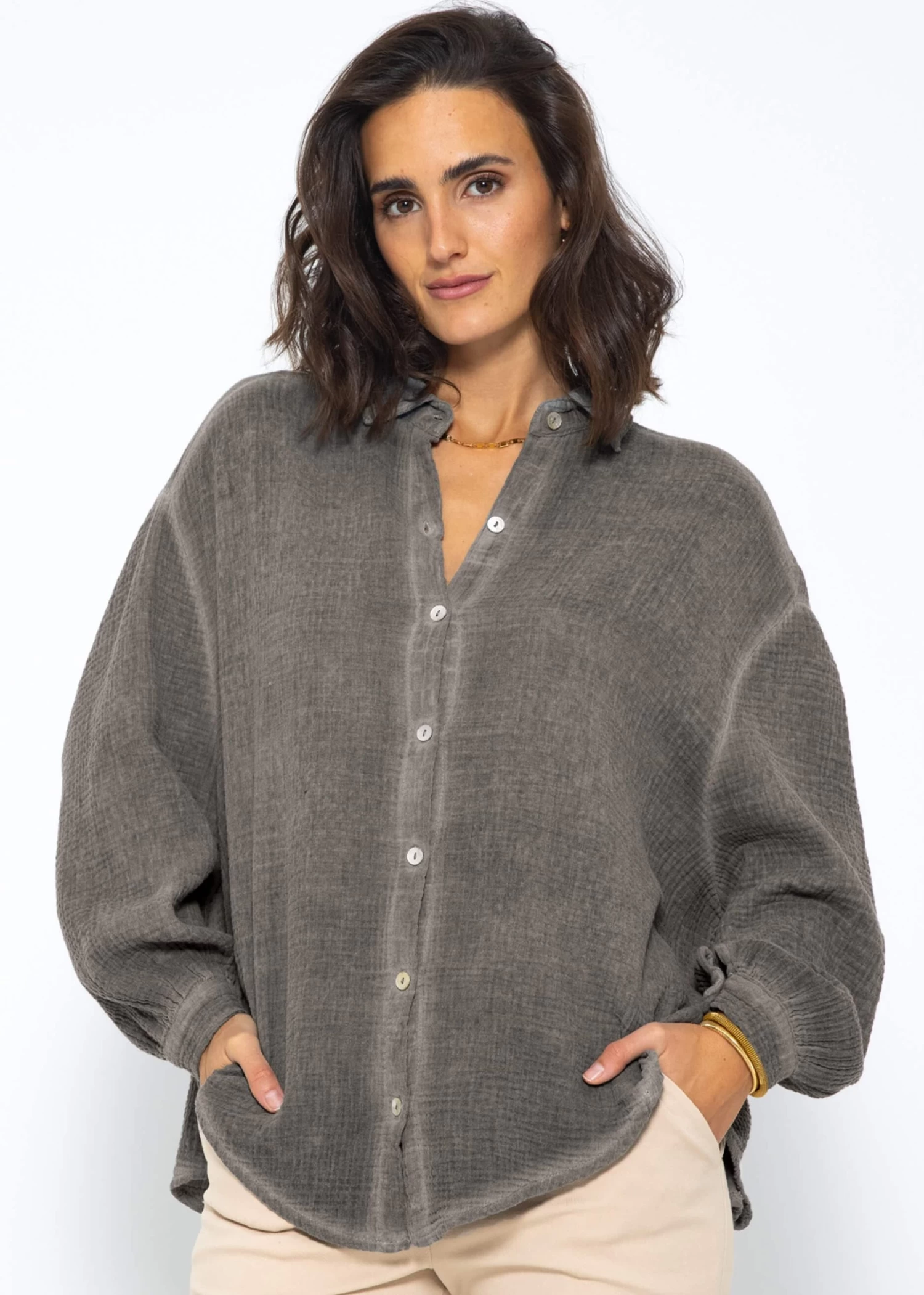 Diese Musselin Bluse verleiht deinem Look einen Hauch von Vintage-Charme und mordernem Stil. Die stylische Longbluse besteht aus dem super soften Trendstoff Musselin und ist daher ein absolutes Must-Have. Sie ist schön oversize geschnitten, fällt hinten etwas länger als vorne und besitzt überschnittene Schultern, wodurch sie ihren lässigen Look erhält. Der Kragen, die Knopfleiste, Manschetten an den langen Ärmeln sowie die querlaufende Falte am Rücken verleihen der verwaschenen Bluse besondere, liebevolle Details und geben ihr einen eleganten Touch. Sie ist ein treuer Begleiter für jede Jahreszeit und du kannst sie vielseitig kombinieren.