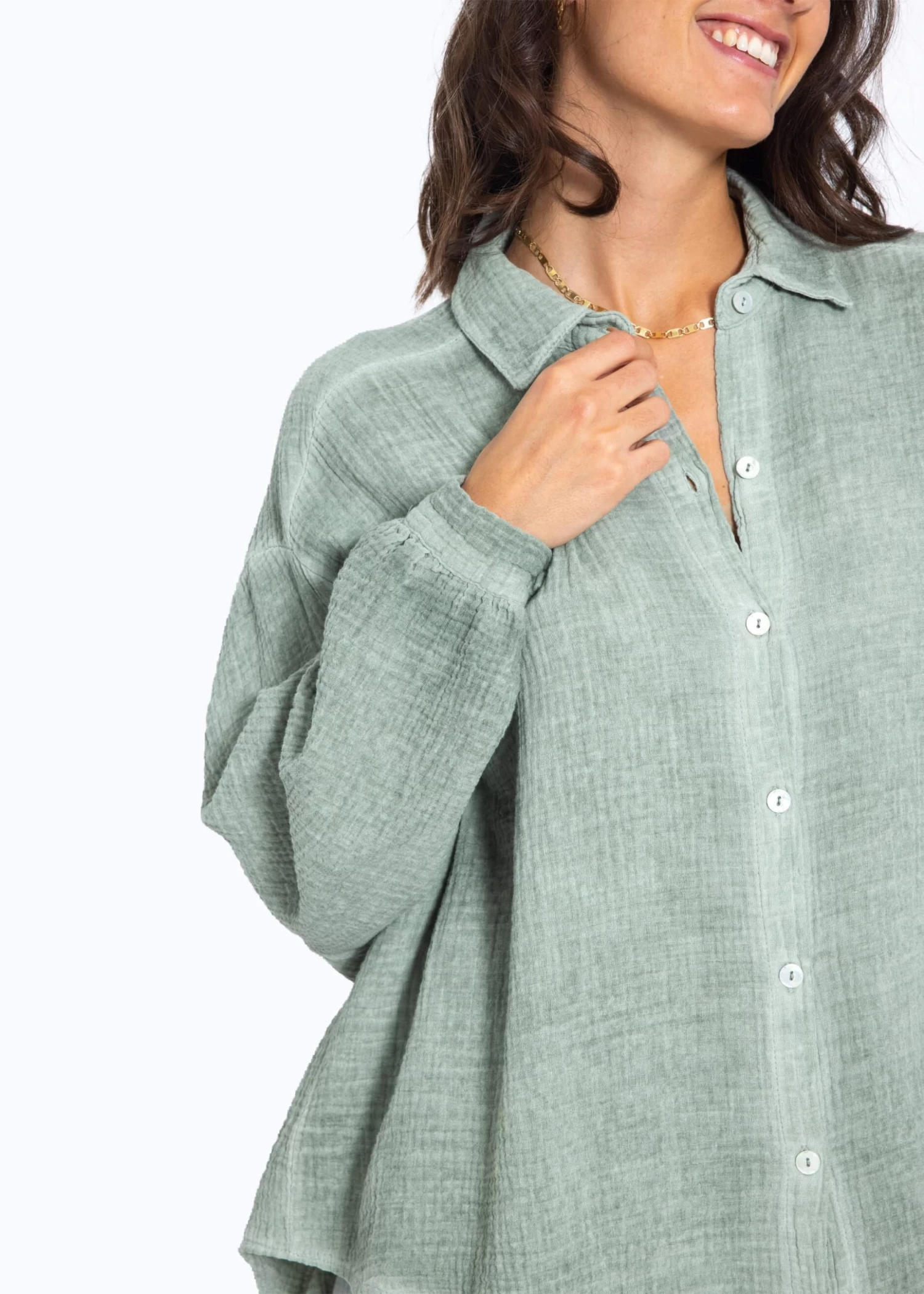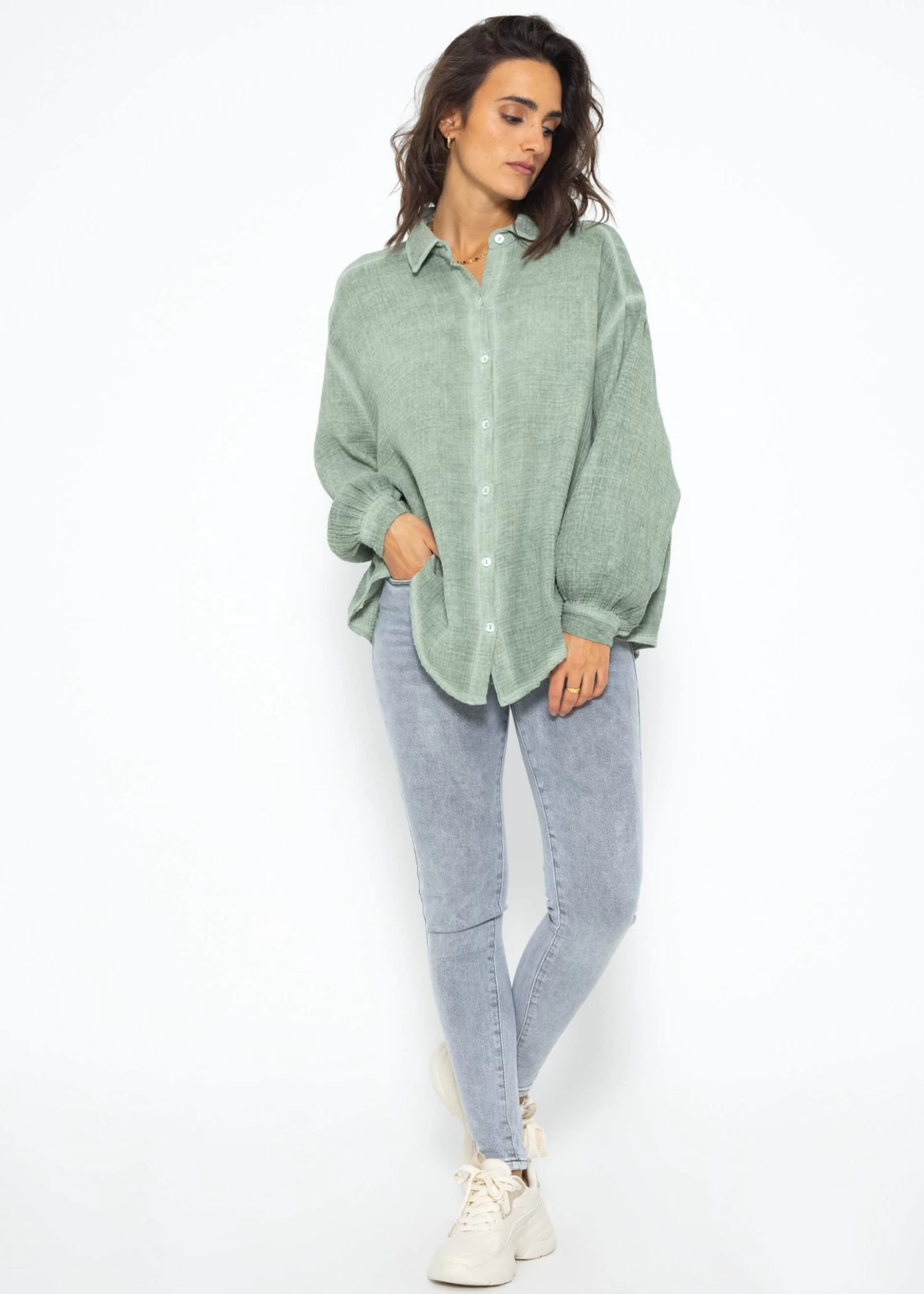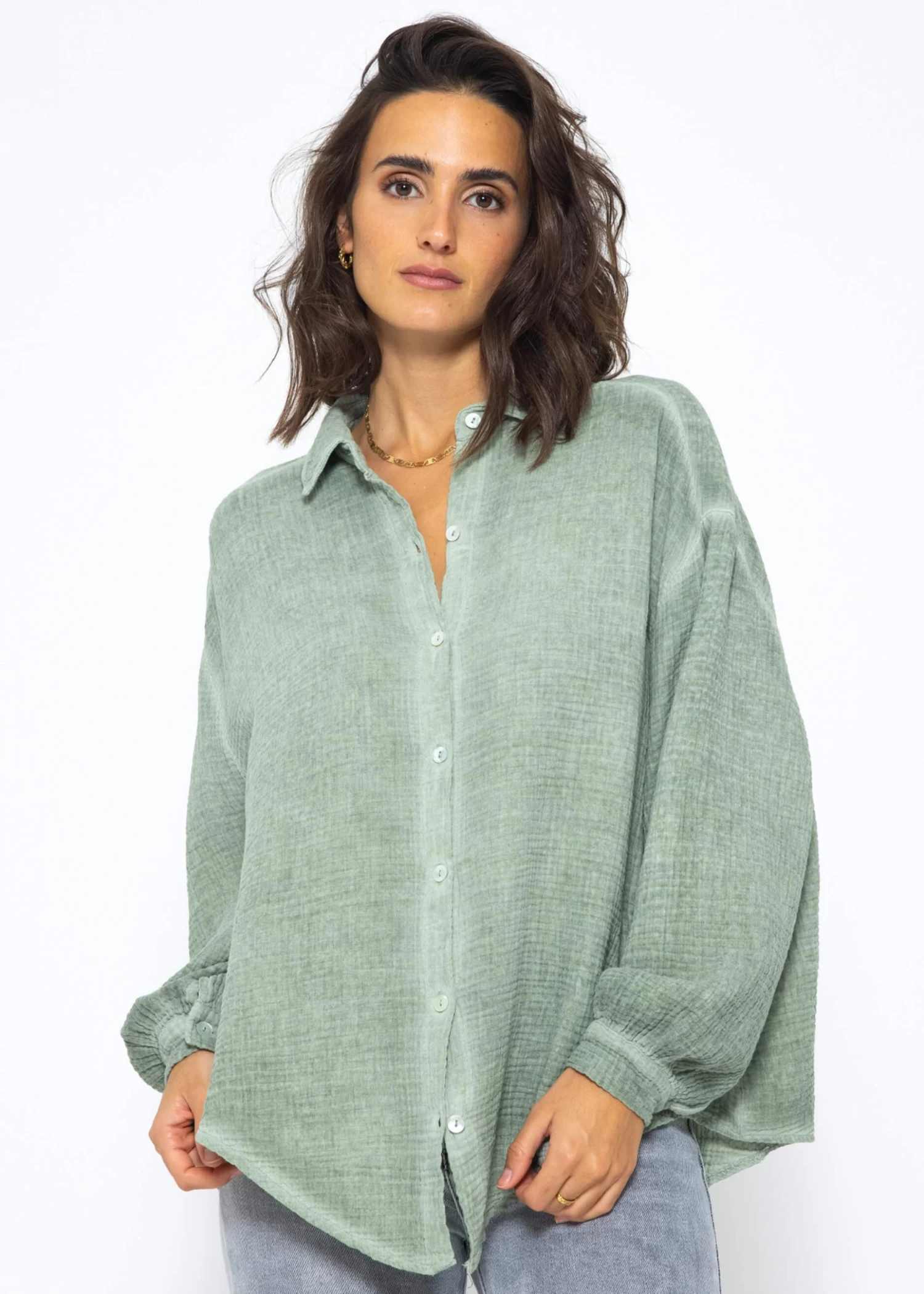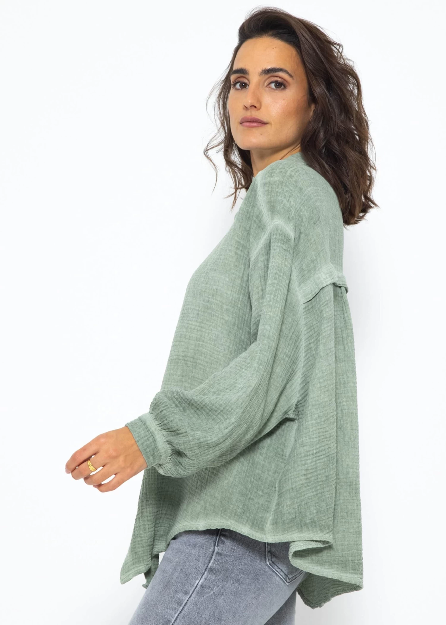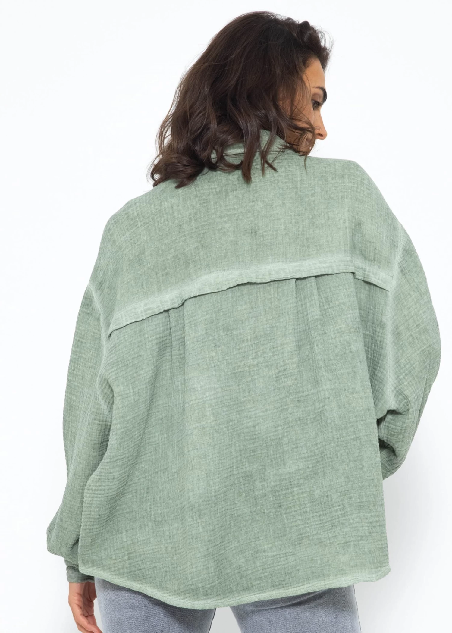 Diese Musselin Bluse verleiht deinem Look einen Hauch von Vintage-Charme und mordernem Stil. Die stylische Longbluse besteht aus dem super soften Trendstoff Musselin und ist daher ein absolutes Must-Have. Sie ist schön oversize geschnitten, fällt hinten etwas länger als vorne und besitzt überschnittene Schultern, wodurch sie ihren lässigen Look erhält. Der Kragen, die Knopfleiste, Manschetten an den langen Ärmeln sowie die querlaufende Falte am Rücken verleihen der verwaschenen Bluse besondere, liebevolle Details und geben ihr einen eleganten Touch. Sie ist ein treuer Begleiter für jede Jahreszeit und du kannst sie vielseitig kombinieren.