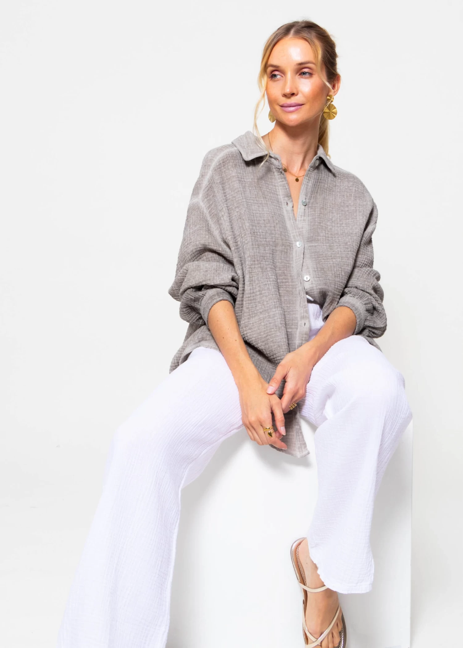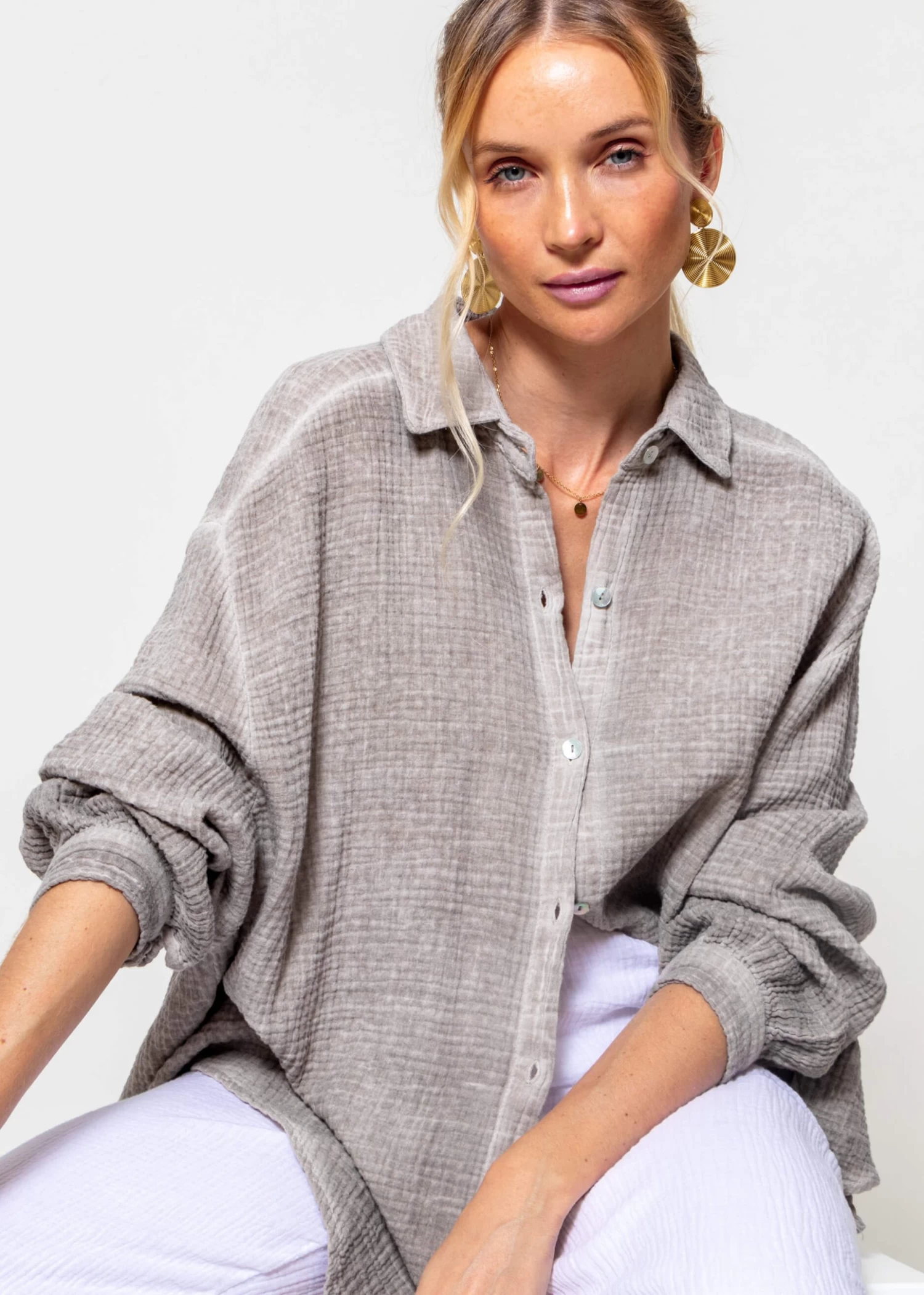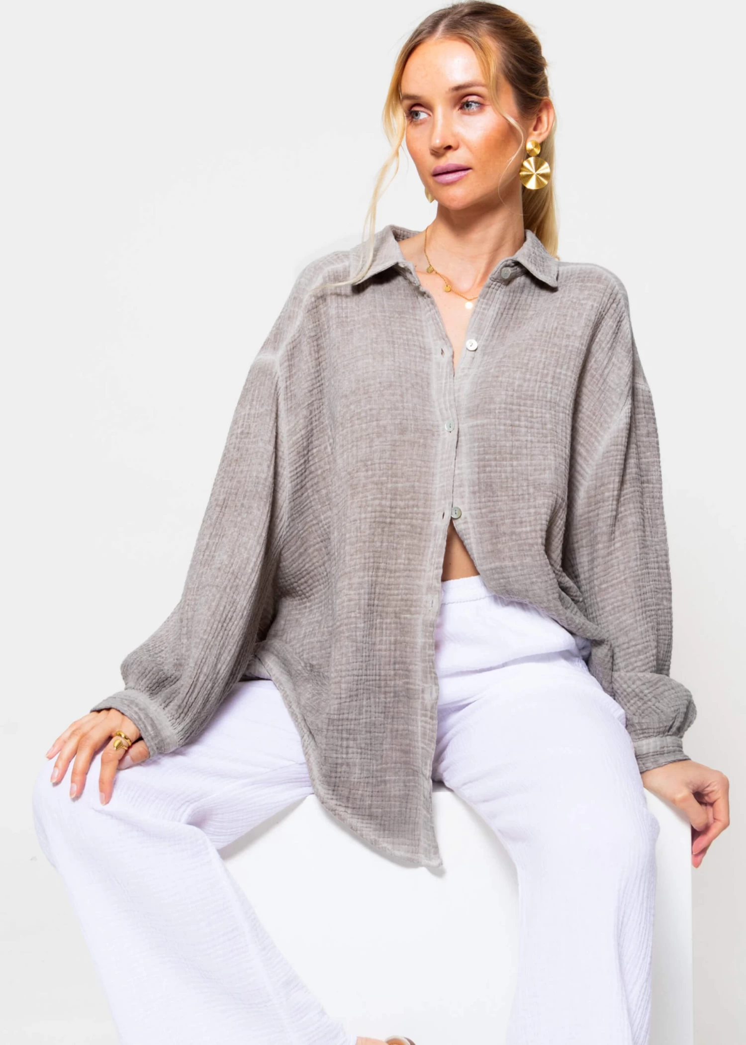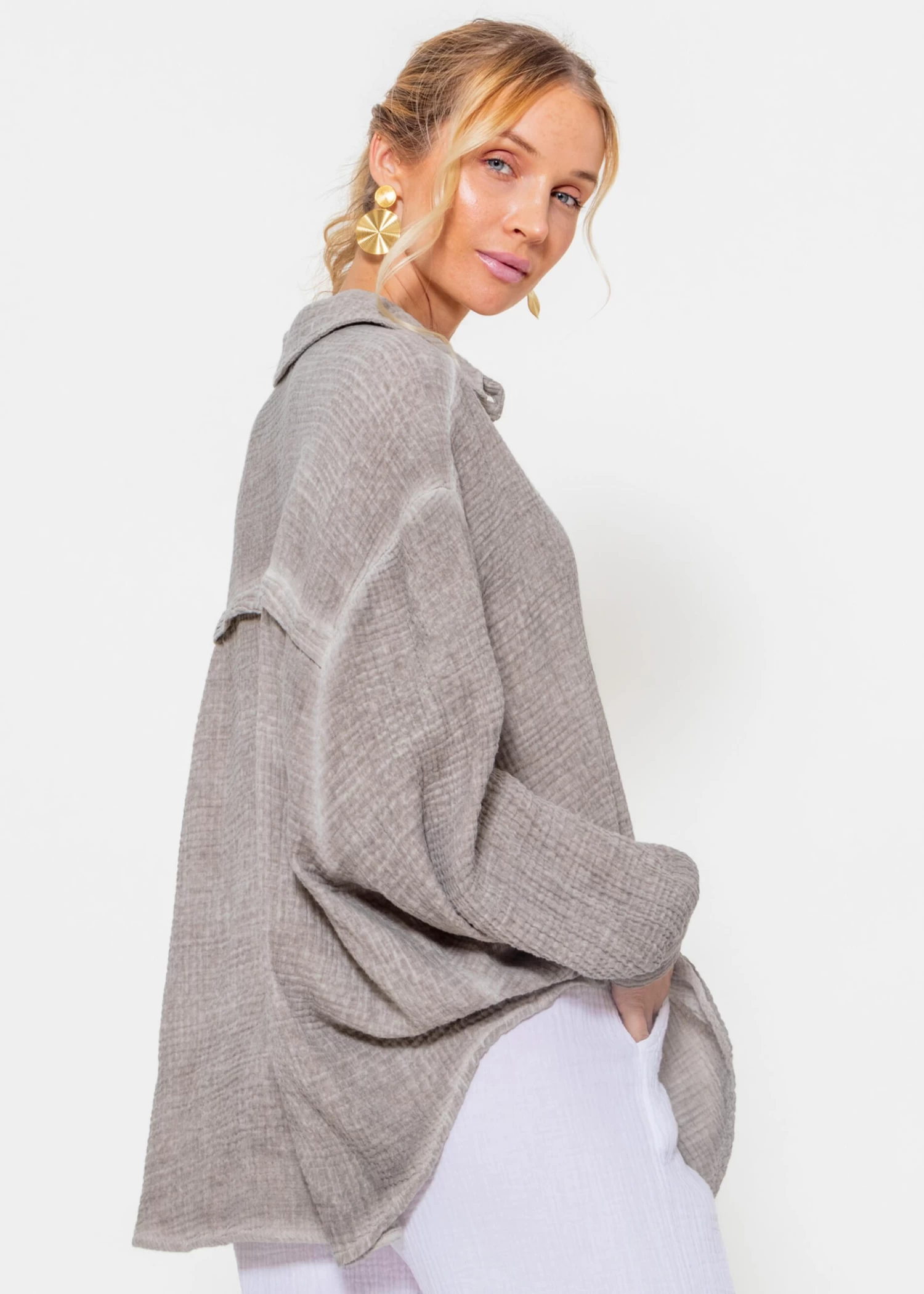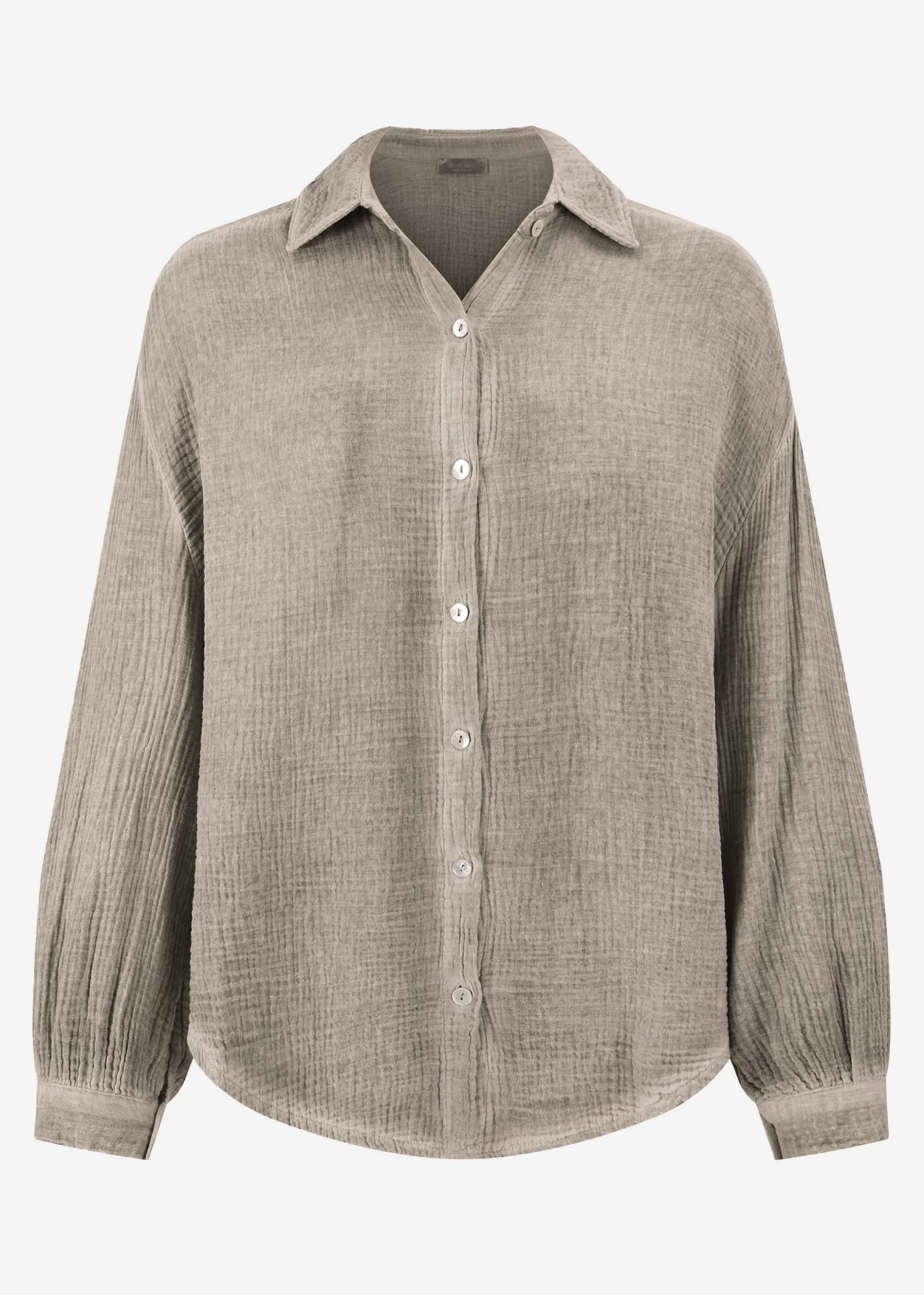 Diese Musselin Bluse verleiht deinem Look einen Hauch von Vintage-Charme und mordernem Stil. Die stylische Longbluse besteht aus dem super soften Trendstoff Musselin und ist daher ein absolutes Must-Have. Sie ist schön oversize geschnitten, fällt hinten etwas länger als vorne und besitzt überschnittene Schultern, wodurch sie ihren lässigen Look erhält. Der Kragen, die Knopfleiste, Manschetten an den langen Ärmeln sowie die querlaufende Falte am Rücken verleihen der verwaschenen Bluse besondere, liebevolle Details und geben ihr einen eleganten Touch. Sie ist ein treuer Begleiter für jede Jahreszeit und du kannst sie vielseitig kombinieren.