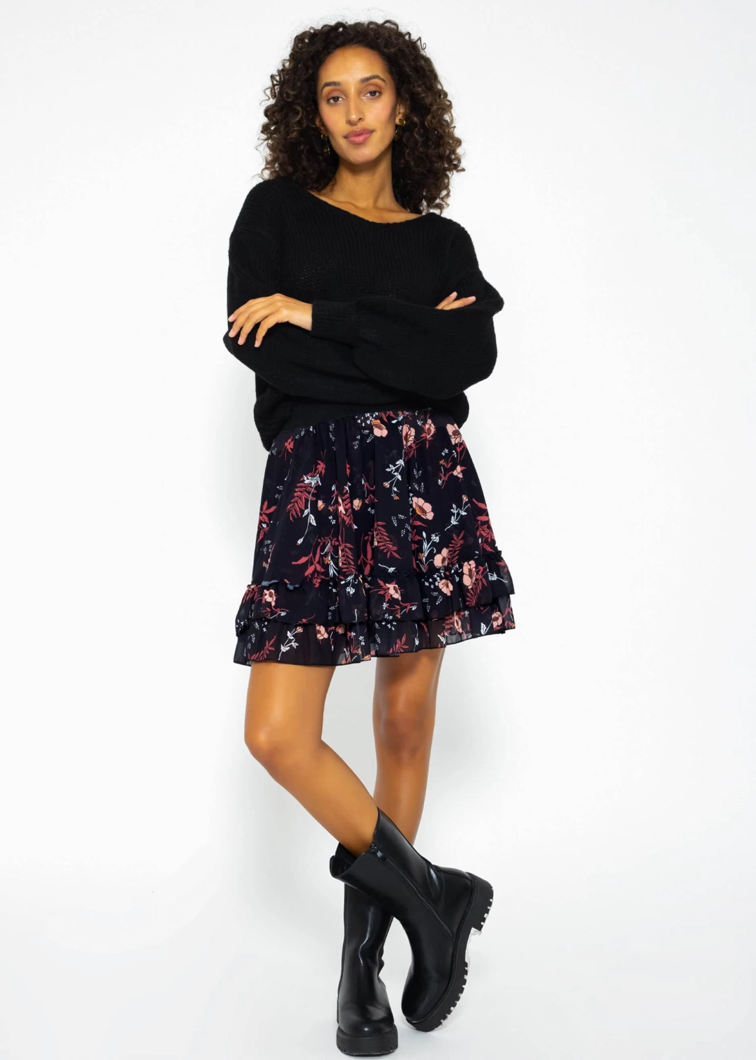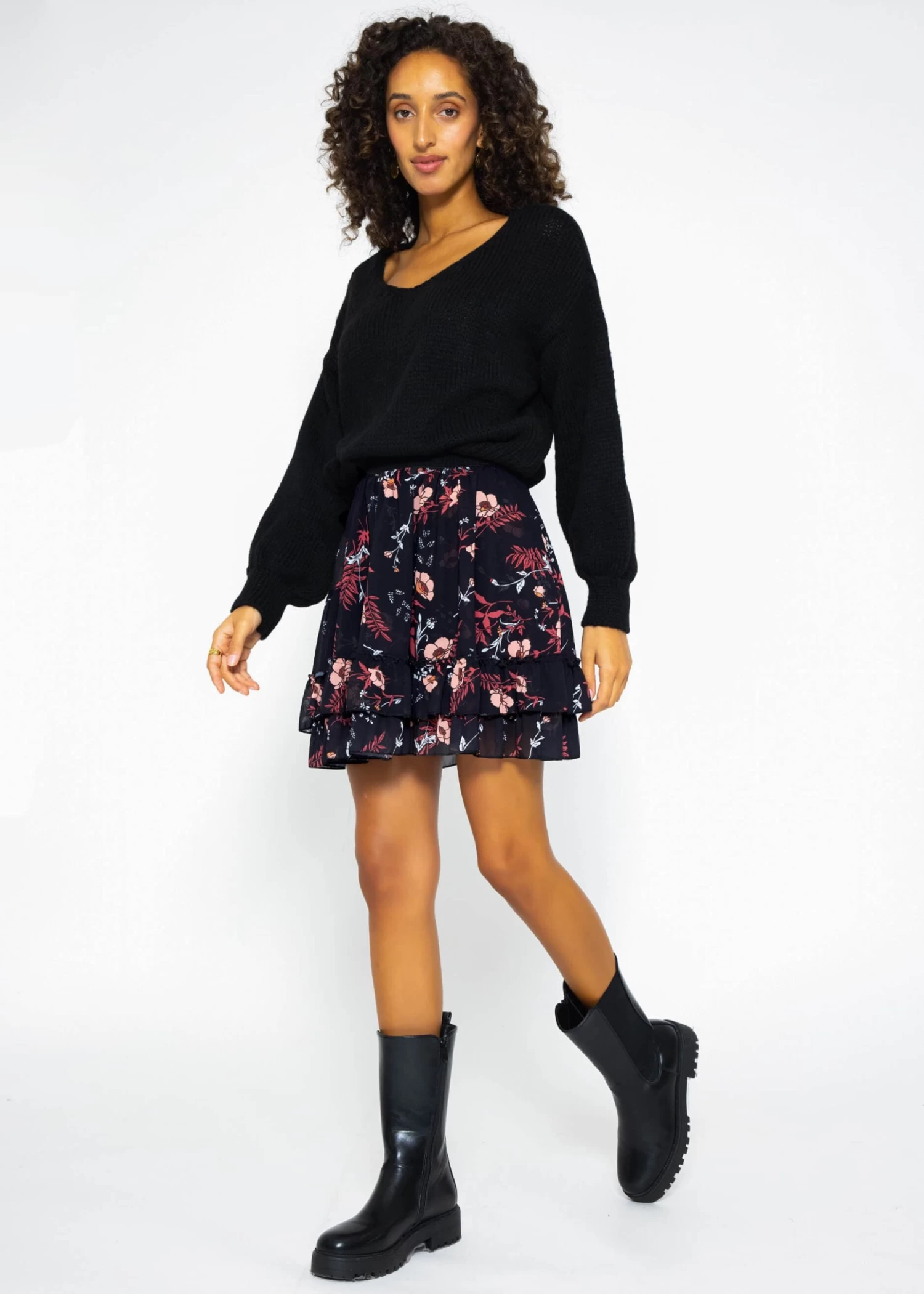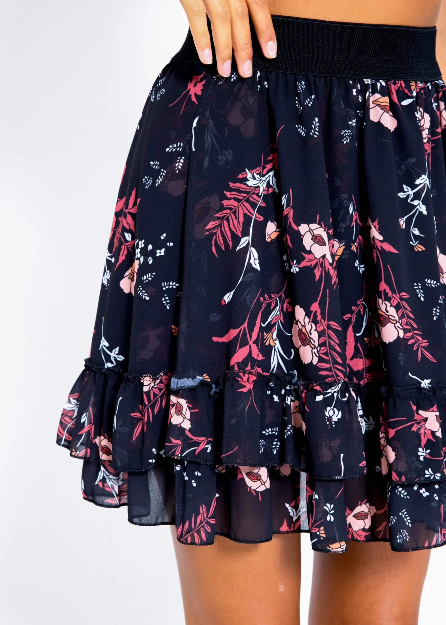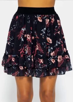 Volants-Rock mit Rüschen und Blumen-Print in schwarz