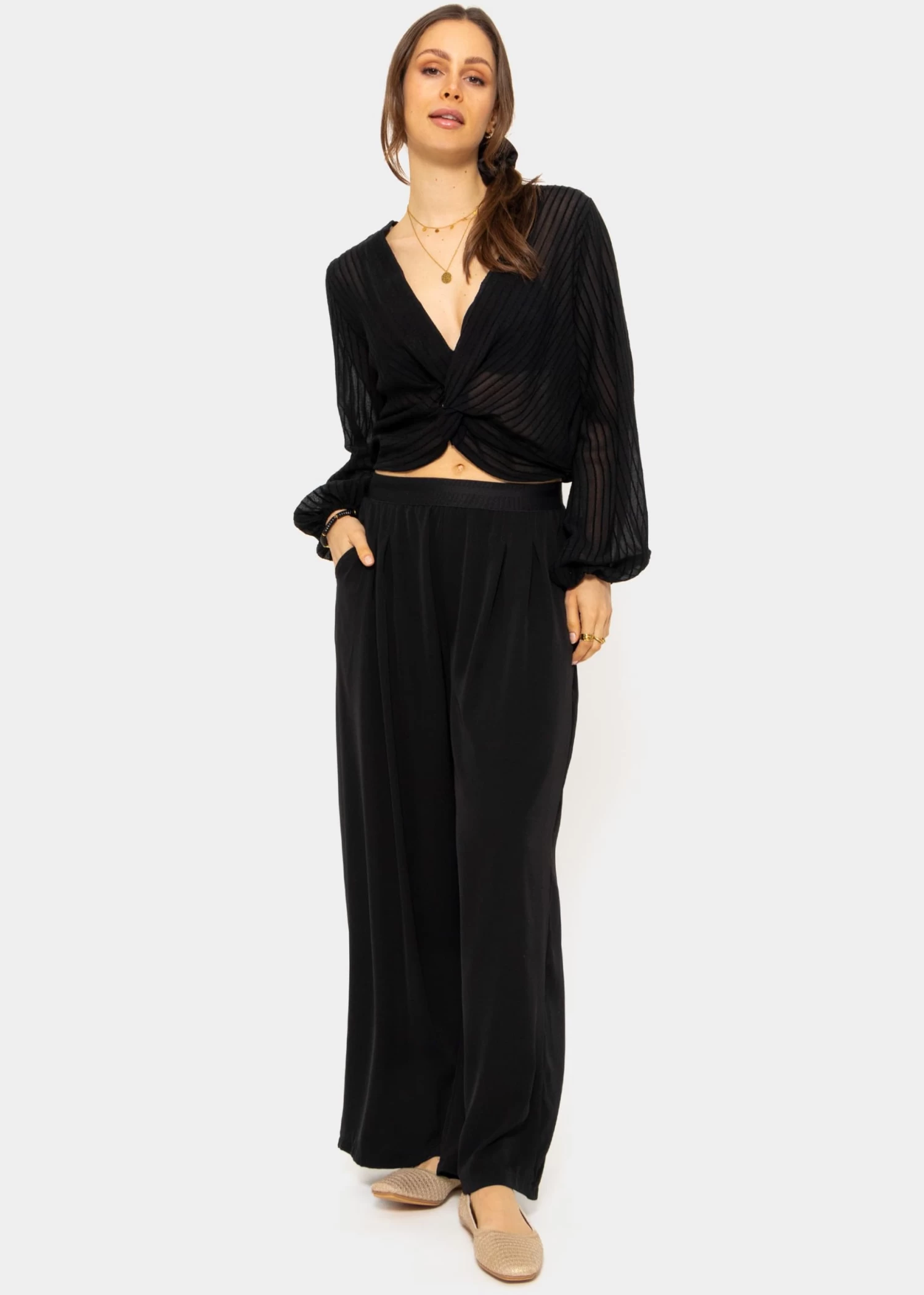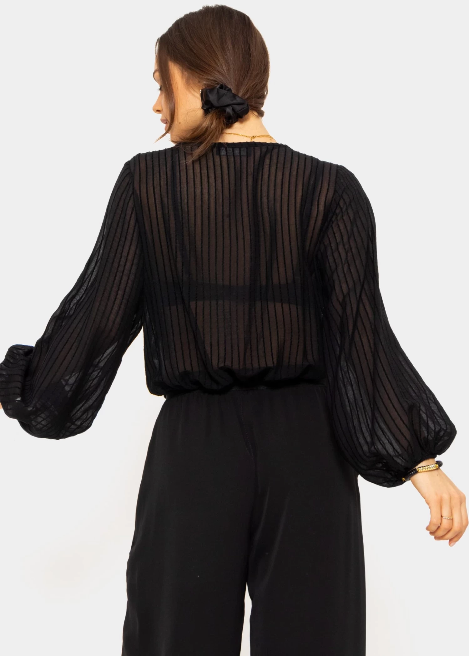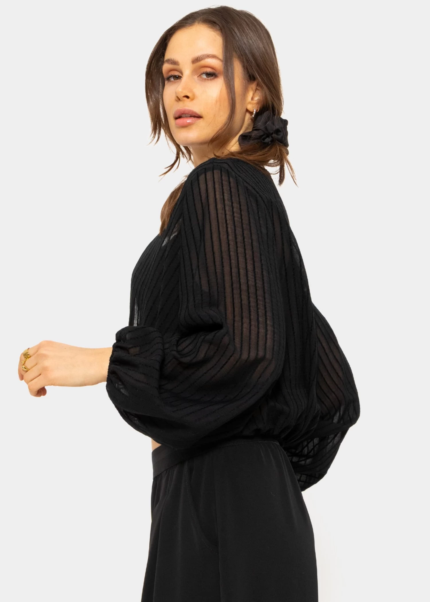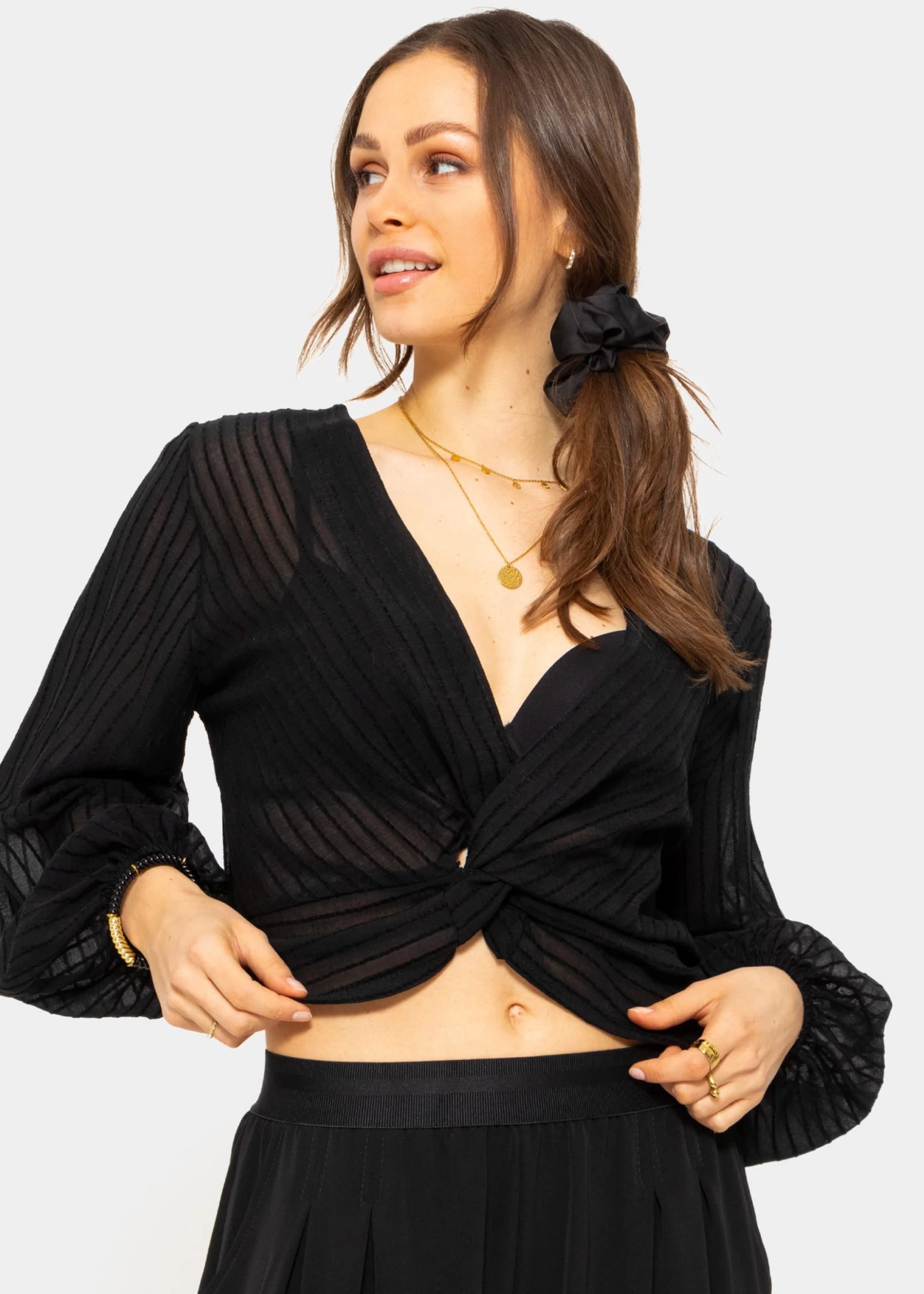 Vorne geschlungene Bluse in Schwarz. Sie präsentiert sich in einem angesagten Cropped-Fit, einem tiefen V-Ausschnitt und einer leichten Oversized-Passform. An den langen, luftigen Ärmeln sowie auf der Rückseite des Tops befinden sich Gummizugabschlüsse, die einen optimalen Sitz garantieren. Das Highlight ist die geschlungene Optik auf der Vorderseite, die zusammen mit dem zarten, gestreiften Material ein frühlingshaftes Trendpiece kreiert. Für einen angesagten Look empfehlen wir die Bluse mit einem langen Denim Rock zu stylen. Als Alternative bietet sich auch eine helle Hose perfekt an, denn sie verleiht in Kombination mit der Bluse sommerliche Frische.