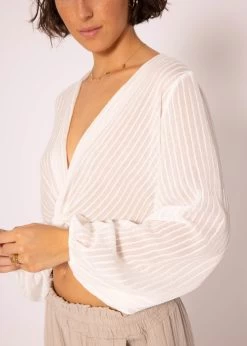 Vorne geschlungene Bluse in Weiß. Sie präsentiert sich in einem angesagten Cropped-Fit, einem tiefen V-Ausschnitt und einer leichten Oversized-Passform. An den langen, luftigen Ärmeln sowie auf der Rückseite des Tops befinden sich Gummizugabschlüsse, die einen optimalen Sitz garantieren. Das Highlight ist die geschlungene Optik auf der Vorderseite, die zusammen mit dem zarten, gestreiften Material ein frühlingshaftes Trendpiece kreiert. Für einen angesagten Look empfehlen wir die Bluse mit einem langen Denim Rock zu stylen. Als Alternative bietet sich auch eine helle Hose perfekt an, denn sie verleiht in Kombination mit der Bluse sommerliche Frische.