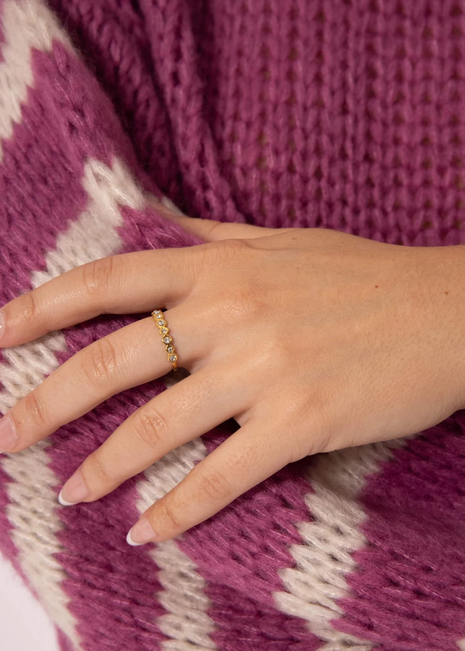 Das Modell besteht aus sorgfältig platzierten, funkelnden Steinchen, die abwechselnd zwischen runden und eckigen Formen wechseln. Das offene Design dieses Rings ermöglicht eine individuelle Anpassung, sodass er mühelos an deinen Finger angepasst werden kann und einen bequemen Sitz gewährleistet. Füge deinem Alltagslook ein strahlendes Element hinzu oder verleihe deinem Abendoutfit den letzten Schliff mit diesem bezaubernden Accessoire.